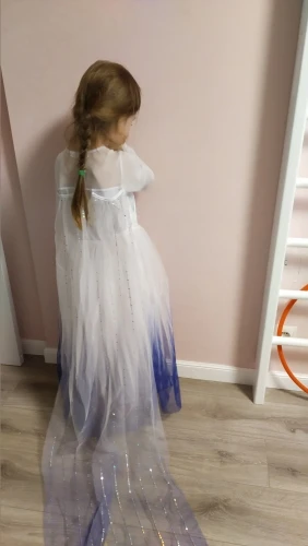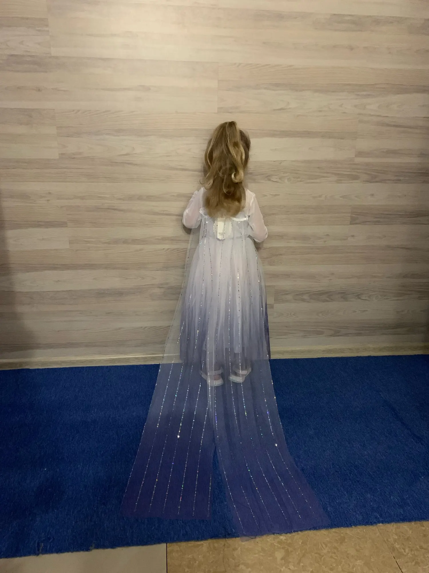 Платье очень красивое! Дочка в восторге! Шлейф красивый, длинный, нитки нигде не торчат. Дочка ростом 110 см - платье по длине как раз, до пола, а в рукавах длинновато, но можно подвернуть. Сзади на спинке у платья есть утягивающие резинки, поэтому подойдёт и на худенькую девочку, как у меня, так и на полненькую.
