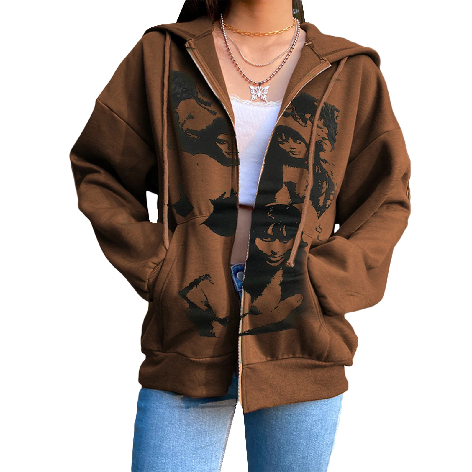 Женское пальто, длинные топы с капюшоном и принтом портрета на молнии и с карманами