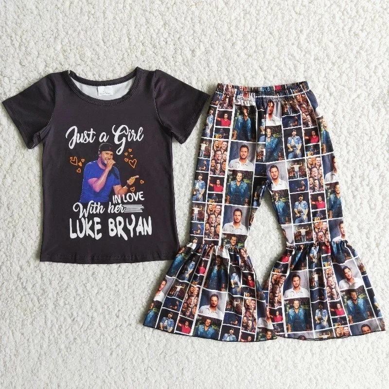Оптовая продажа, Детский бутик одежды для маленьких девочек, комплект черной рубашки с коротким рукавом, музыкальный певец, детские штаны с колокольчиками, модная одежда