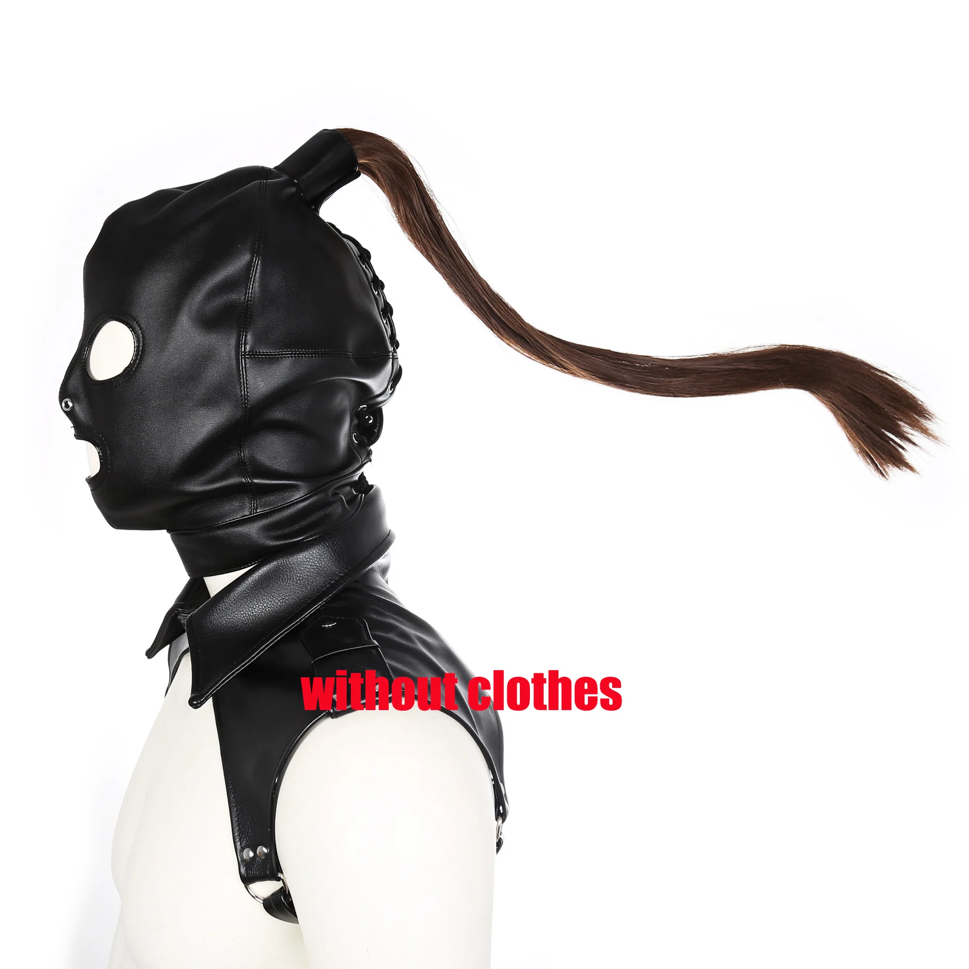 БДСМ эротическая маска с капюшоном Сексуальная искусственная кожа повязка на голову Вечерние Маски интимные игрушки для женщин мужчин раб Косплей флирт волосы конский хвост головной убор