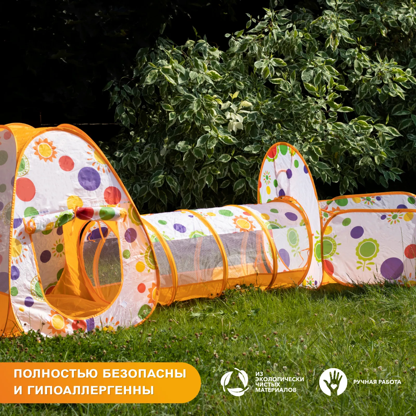 Игровой детский комплекс в виде палатки и сухого бассейна, соединенных друг с другом тоннелем, подойдет для мальчиков и девочек разных возрастов. Для изготовления конструкций применяются натуральные материалы. Они безопасные для детей, гипоаллергенные.