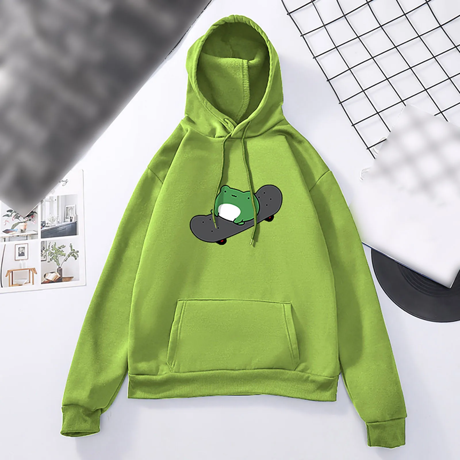 Женская толстовка с капюшоном, зеленая Толстовка с длинным рукавом и принтом лягушки, Свободный пуловер большого размера в стиле Харадзюку на шнуровке