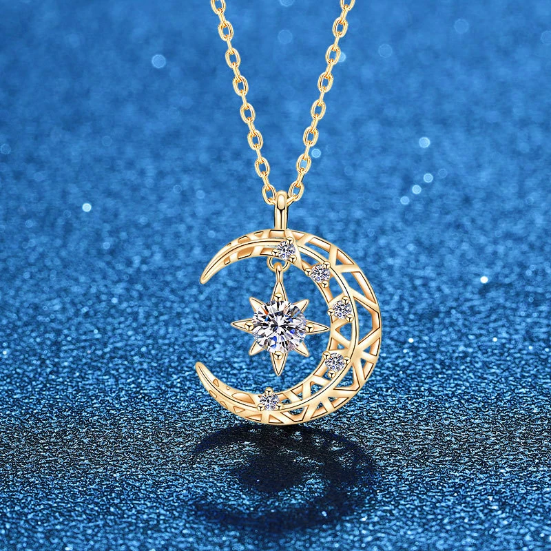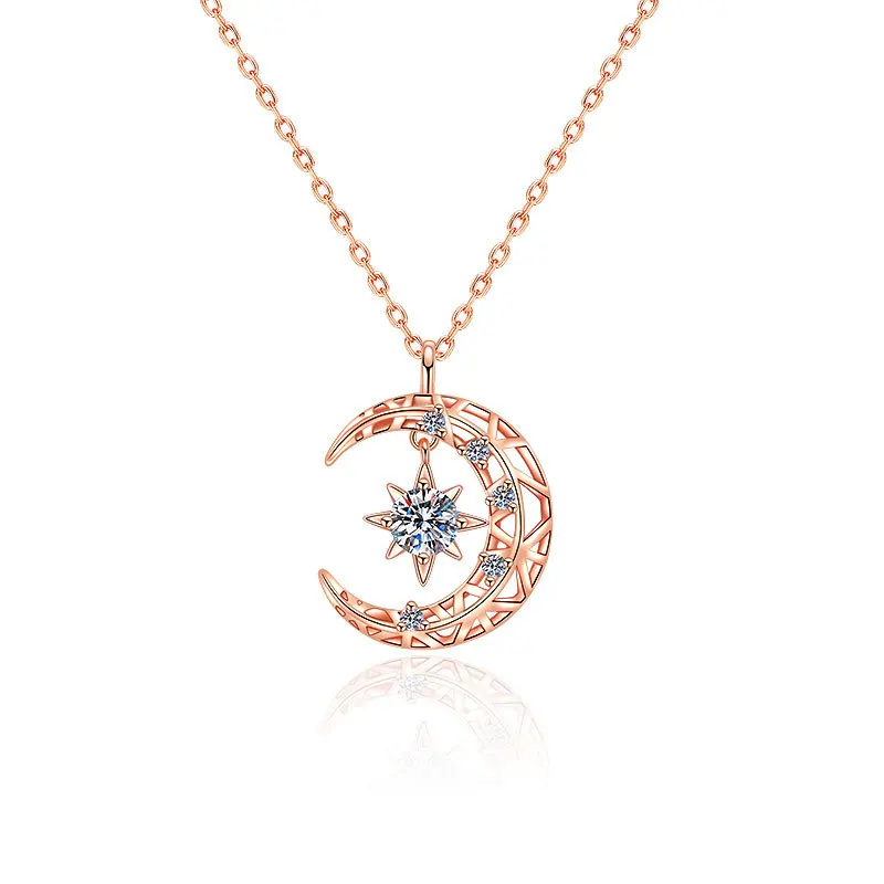 Женское Ожерелье с бриллиантом Moissanite, 14K, розовое золото, серебро 925 пробы, подвеска с Луной и звездой, ювелирные украшения