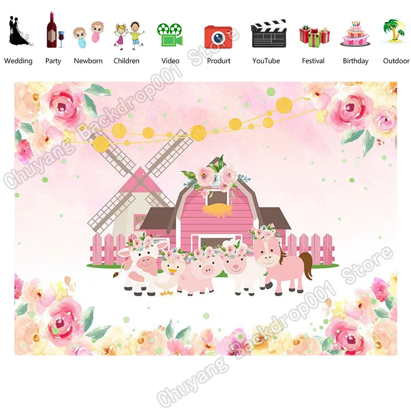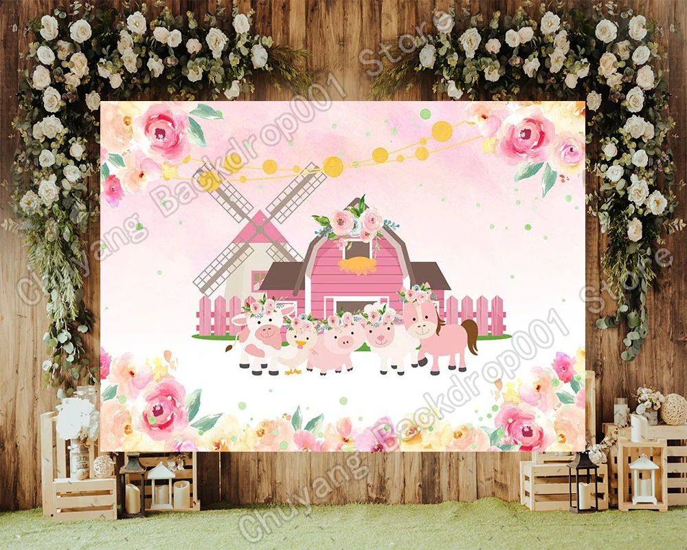 Фон для студийной фотосъемки с изображением мультяшной розовой фермы деревенского загородного двора животных Цветочная девушка день рождения