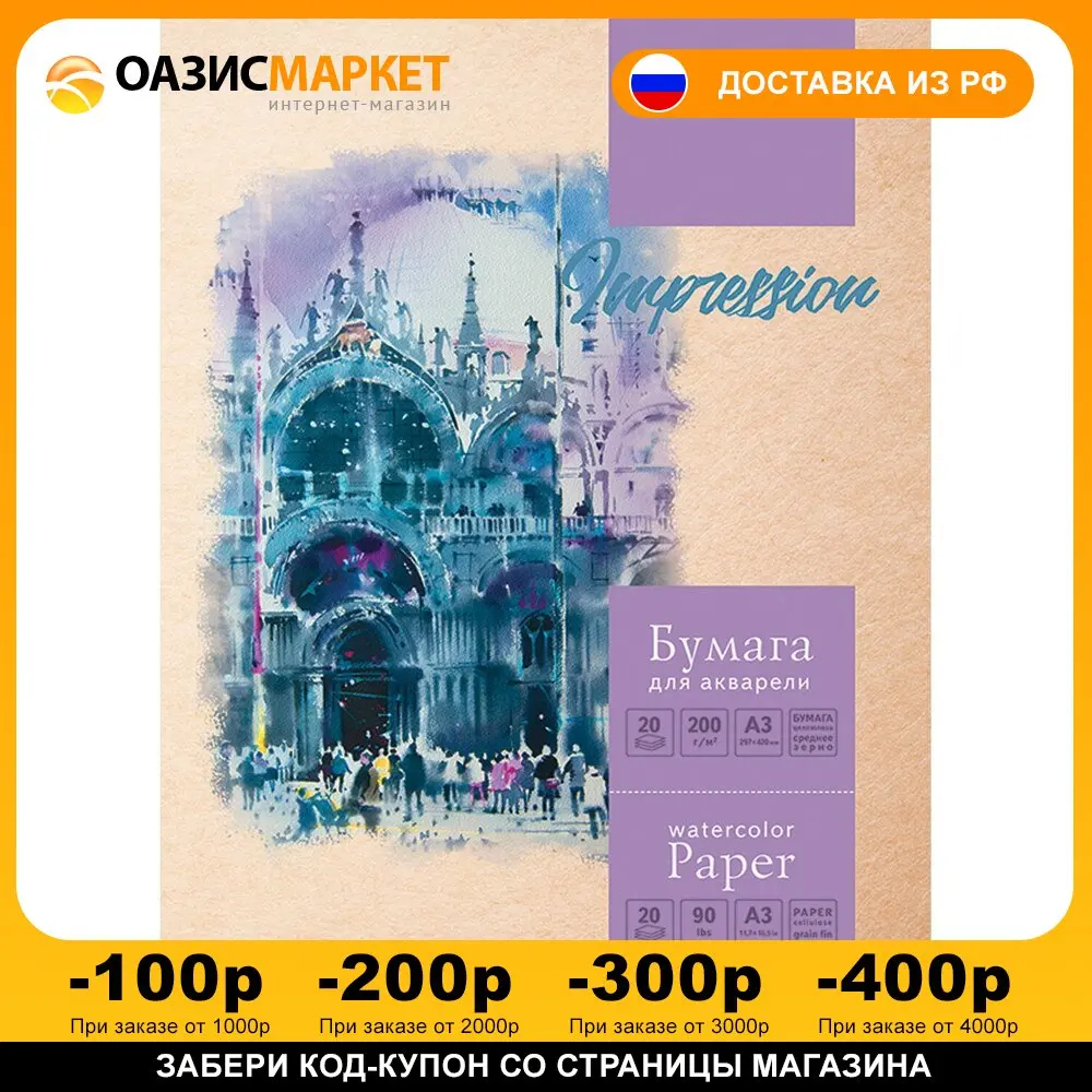 Набор бумаги для акварели А3 формата. Внутренний блок 20 листов, отличается качеством и плотностью бумаги 200 г/м2. Папка изготовлена из высококачественного мелованного картона и дополнена спецэффектом в виде тиснения.