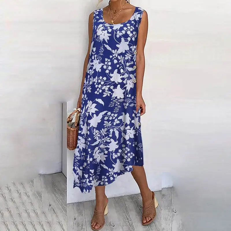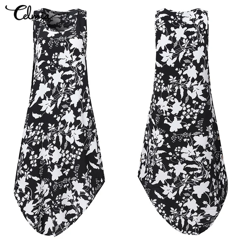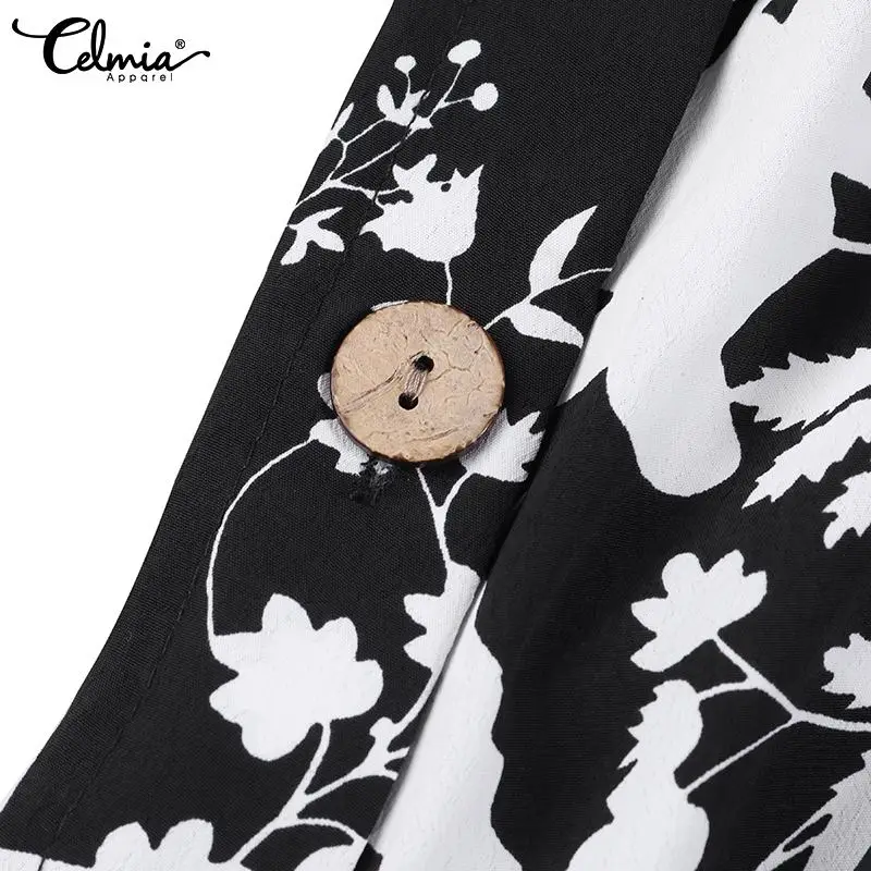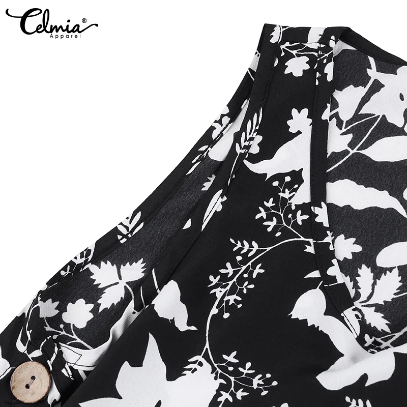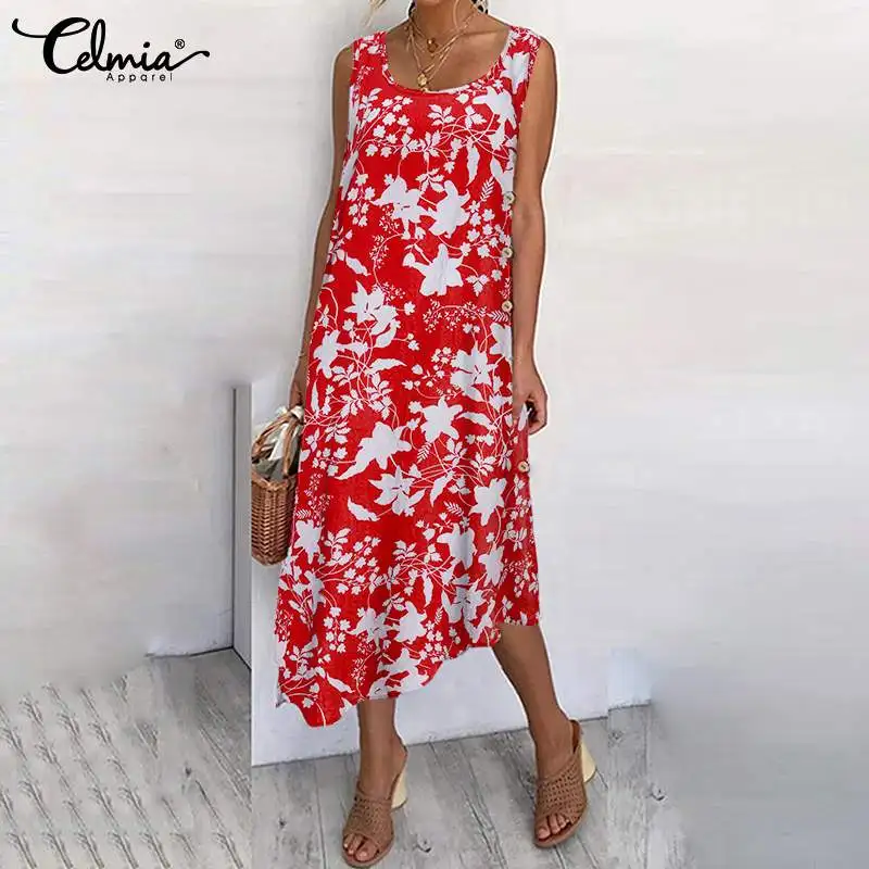 Богемный сарафан Celmia, летнее женское платье с растительным принтом, с круглым вырезом, сексуальный Асимметричный Подол, без рукавов, Повседневное платье-миди на пуговицах, платье