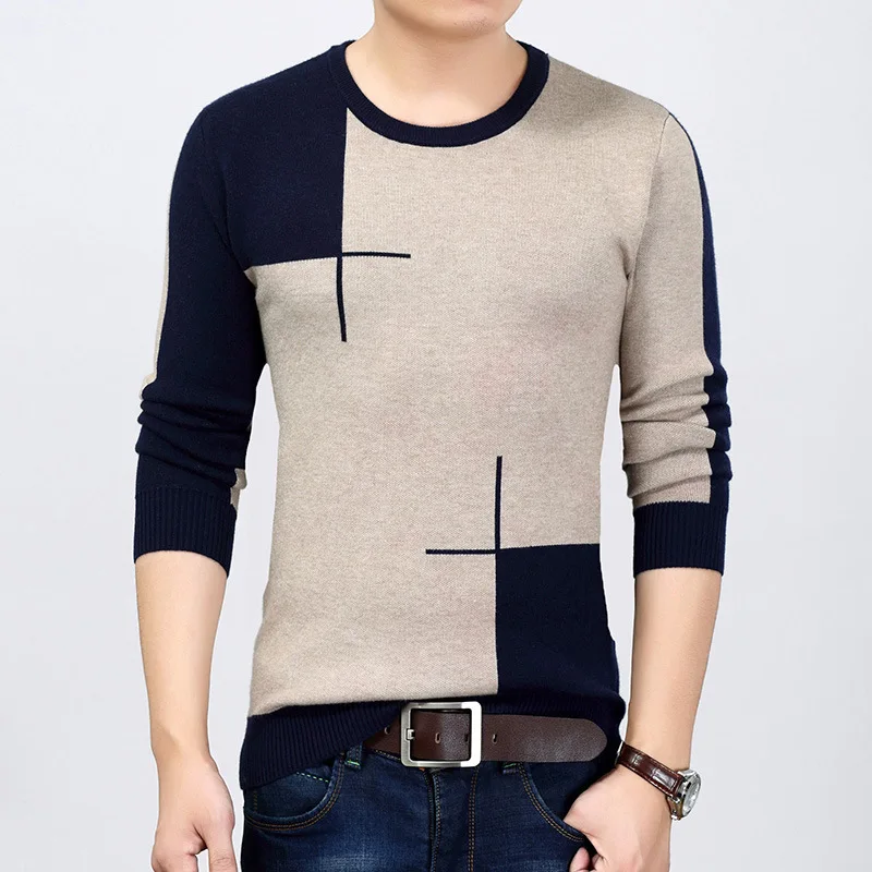 Мужской трикотажный свитер с круглым вырезом, приталенный силуэт