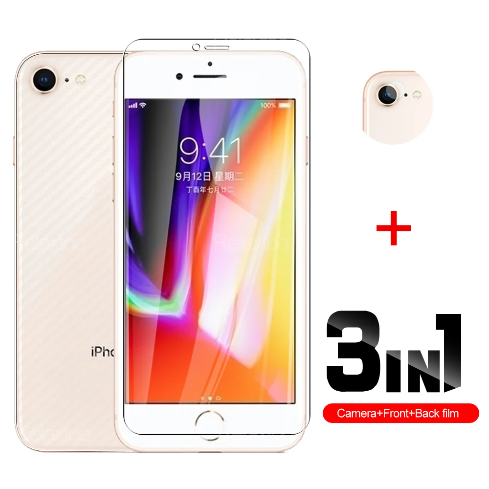 3-в-1 с уровнем твердости 9H для передней панели + мягкие контактные линзы + волокна наклейка на заднюю часть для Apple iPhone 8, 7, 6, 6S Plus протектор экрана из закаленного стекла защитное стекло на iPhone8
