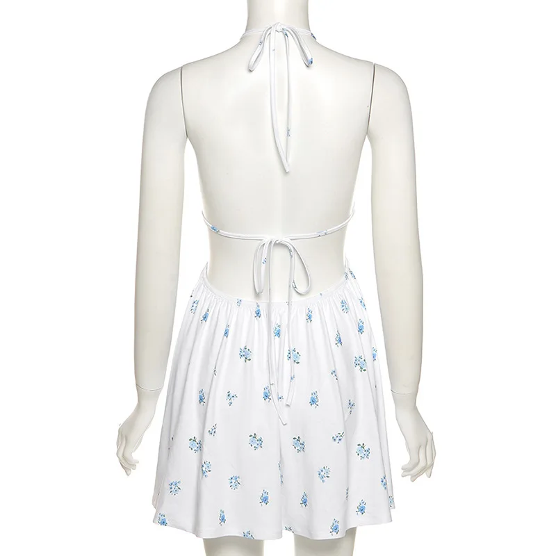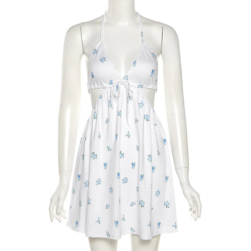 Женское мини-платье с открытой спиной, Летнее белое платье с цветоч...