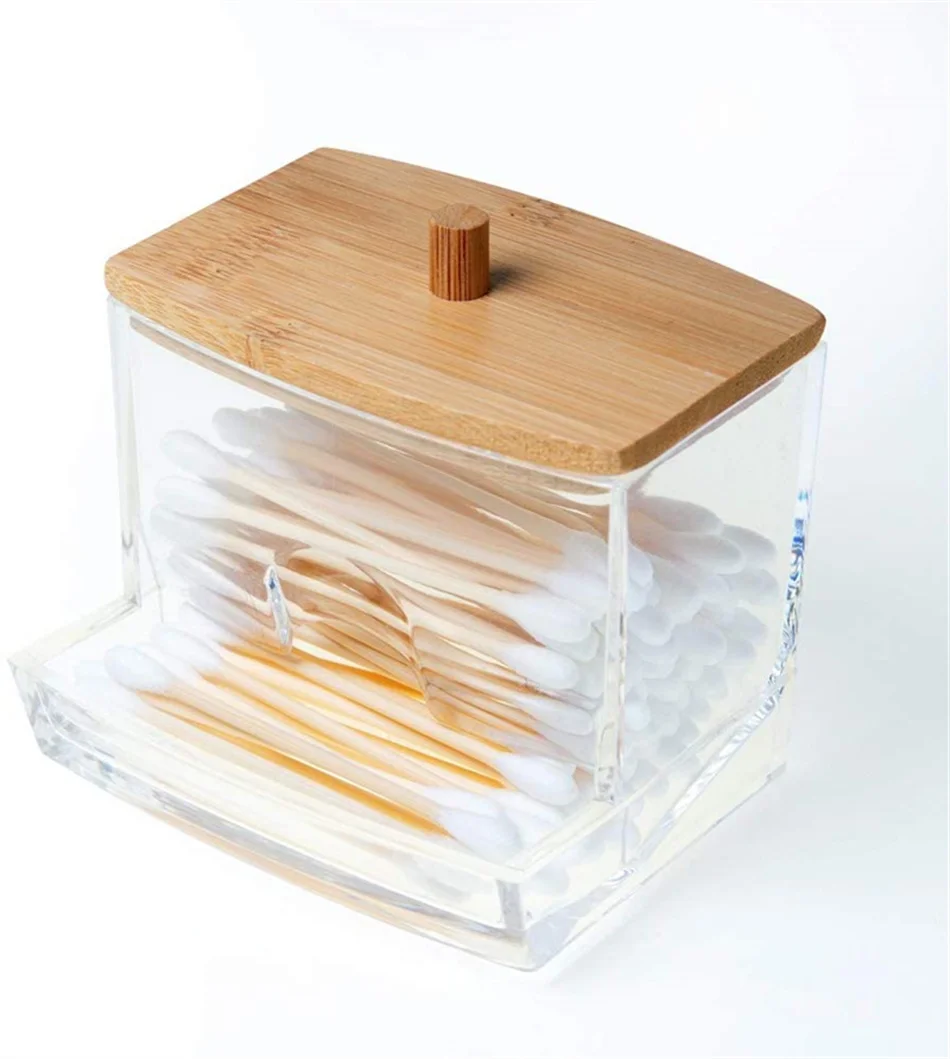 Акриловый держатель Qtip с бамбуковой крышкой, прозрачный маленький диспенсер для ватных палочек, держатель для тампон на палочке, Квадратный Контейнер для хранения зубочисток