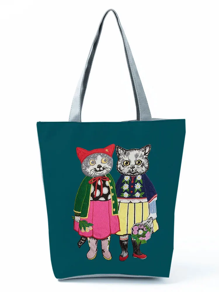 Повседневные женские сумки для улицы, сумка-тоут с мультяшным принтом кошки, вместительная зеленая сумка для покупок, Экологически чистая многоразовая женская сумка через плечо
