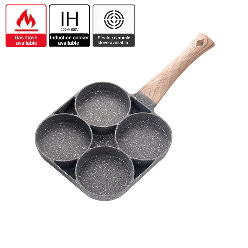 Сковорода для жарки с четырьмя отверстиями, сковорода антипригарная, сковорода, кастрюля для яиц, стейков, ветчины, оладий с деревянной ручкой, кухонная утварь для готовки и завтрака