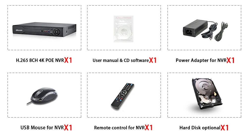 1 сетевой видеорегистратор 8CH 4K POE NVR;1 x Блок питания для NVR;1 х USB мышь для NVR;1 компакт-диск программного обеспечения для NVR;1 пульт дистанционного управления для NVR;Жесткий диск опционально!