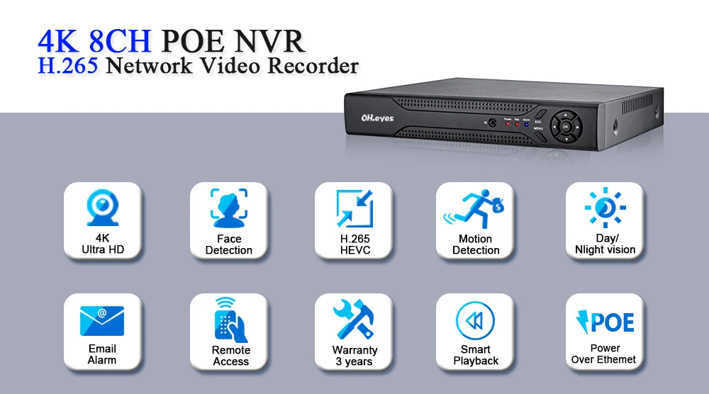 Видеорегистратор OH.eyes 4K 8CH POE NVR H.265 с аудиовыходом для камеры видеонаблюдения POE IP (1080P4MP5MP8MP4K)