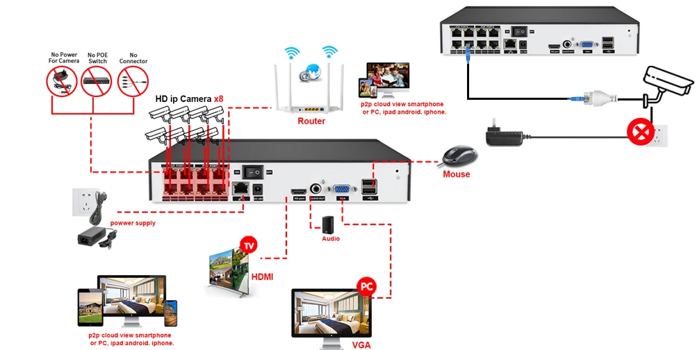 Простая настройка, всего 4 шага для просмотра мобильный телефон, просмотра видео в режиме реального времени из любого места и в любое время с помощью смартфона, стола или ПК с передовой технологией P2P, вы можете получить удаленный доступ к вашей системе за считанные минуты или меньше, нет необходимости в переадресации, удаленный доступ никогда не был таким простым!