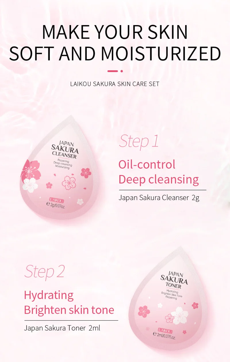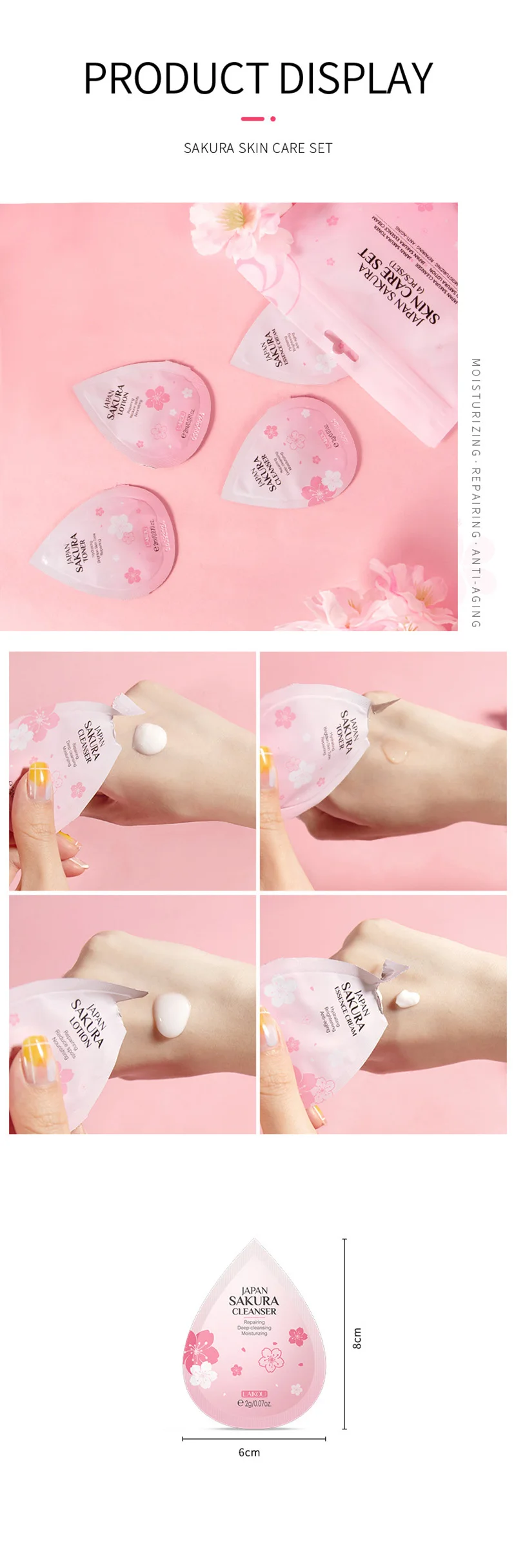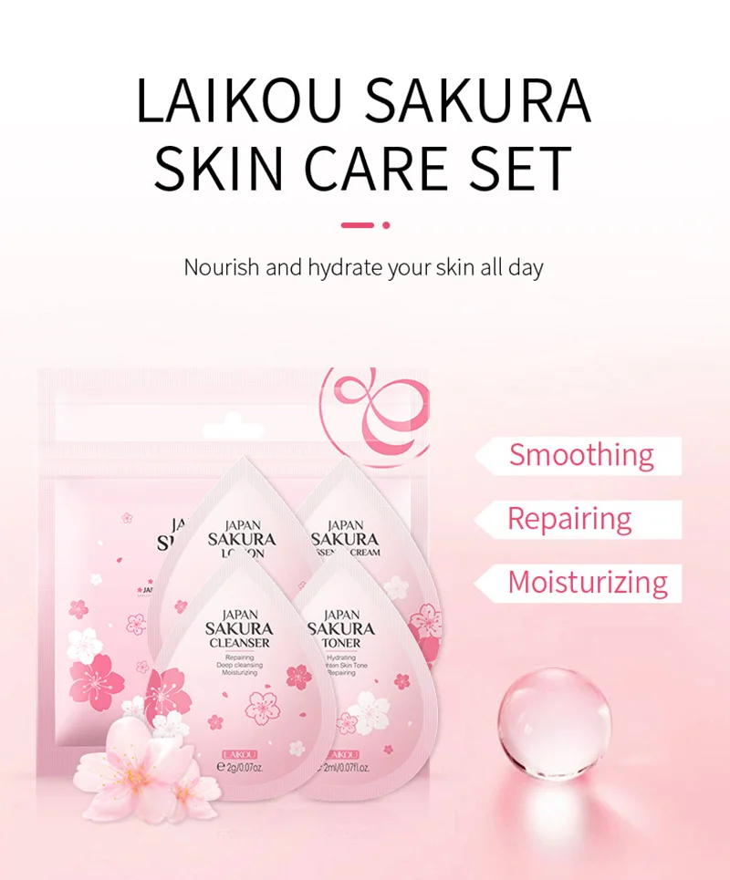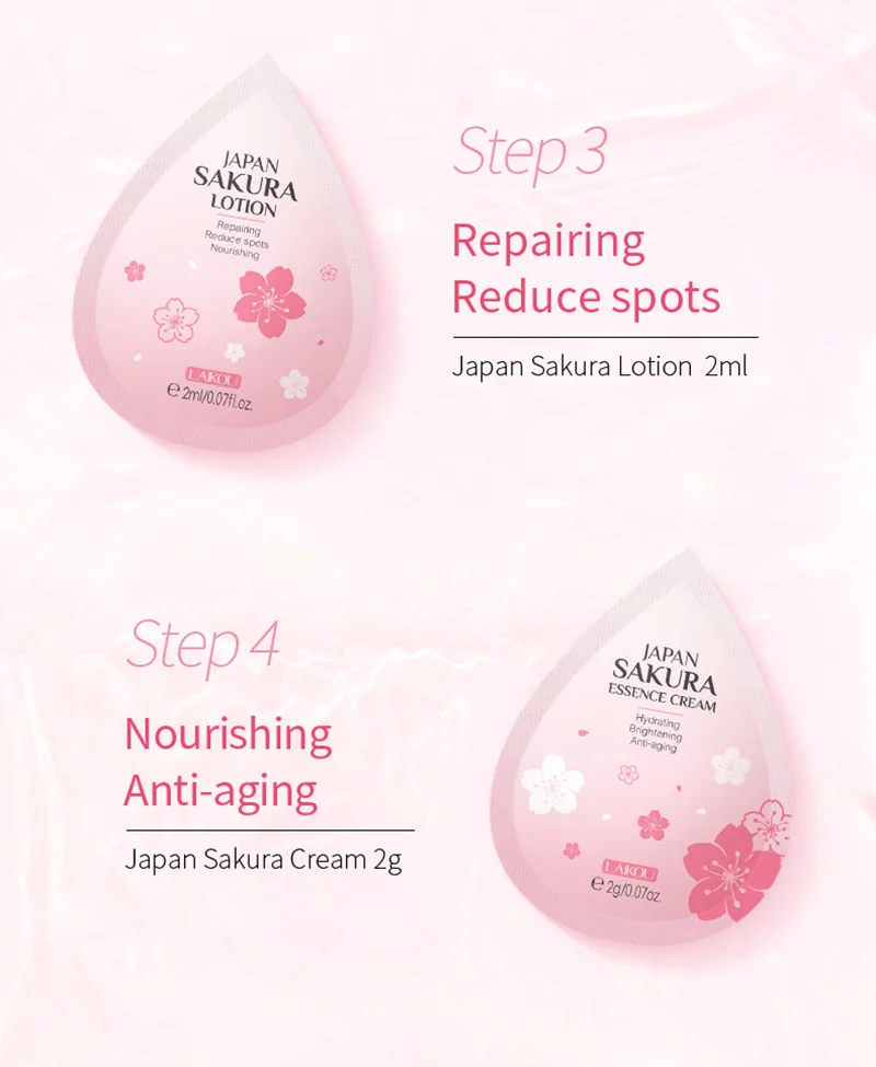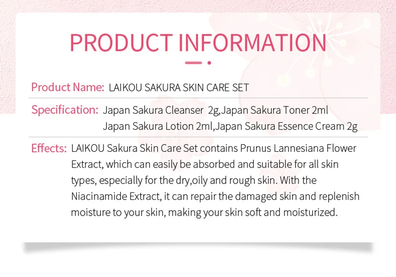 Название продукта: набор для ухода за кожей SakuraДополнительно: четыре в одном Suit-50PCS / Cleanser-200PCS / Toner-200PCS / Lotion-200PCS/эссенция Cream-200PCSСпецификация: Япония Сакура моющее средство 2 г, Япония Сакура тонера 2 млЯпония Сакура лосьон 2 мл, Япония Сакура эссенция крем 2 гЭффекты: набор Сакура для ухода за кожей содержит экстракт цветка подреза ланнесиана, который легко впитывается и подходит для всех типов кожи, espeialy для сухой, жирной и грубой кожи. С экстрактом ниацинамида, он может восстановить поврежденную кожу и пополнять влагу для вашей кожи, делая вашу кожу мягкой и увлажненной.