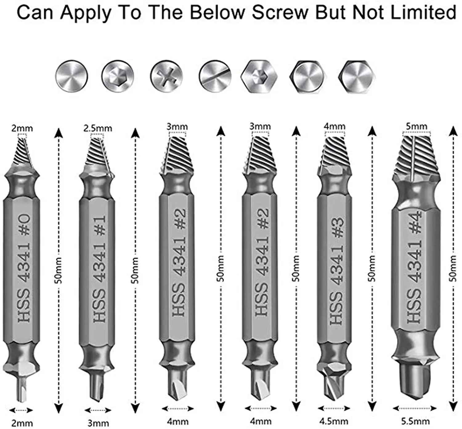 Набор экстракторов винтов из 6 частей-набор экстракторов винтов (#0, #1, #2, #2, #3, #4) работает с любым сверлом и винтом или болтом любого размера. Этот поврежденный винтовой экстрактор может удалить все обычные размеры поврежденных, разбитых или сломанных винтов.
