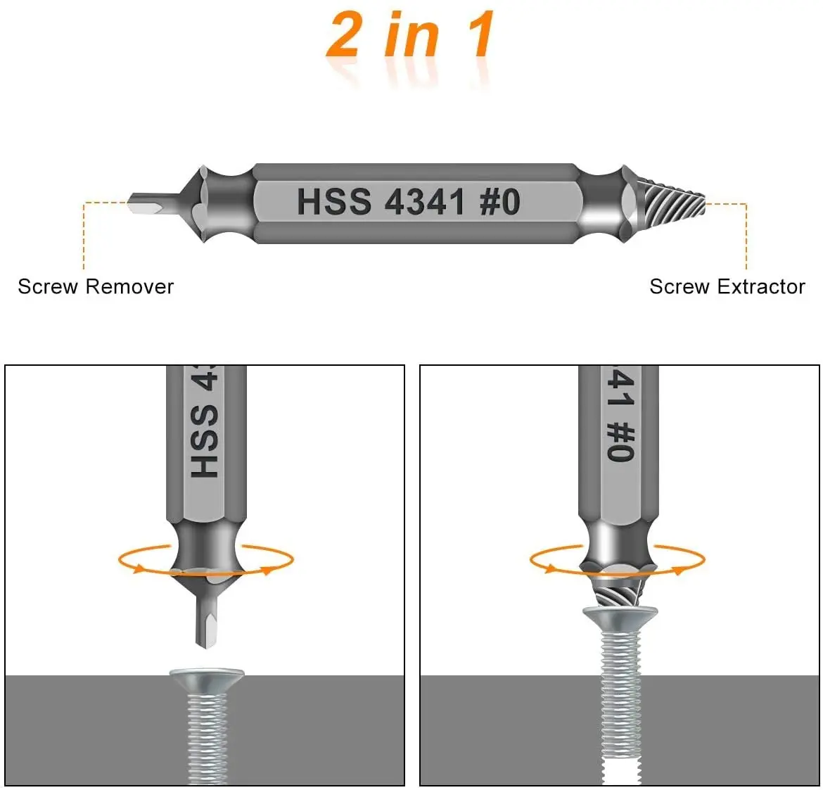 Удобный для пользователя-два простых шага, сначала вам просто нужно сверло, выберите немного меньше поврежденного винта и начните извлечение с помощью сверла/наконечника полировки и сверления, чтобы создать чистое отверстие (убедитесь, что сверло в обратном направлении во время процесса). Затем переключите сверло на наконечник извлечения и используйте последовательное давление вниз (и медленную скорость), чтобы наконечник извлечения «укусил» в поврежденный винт, И затем вы можете легко снять винт.