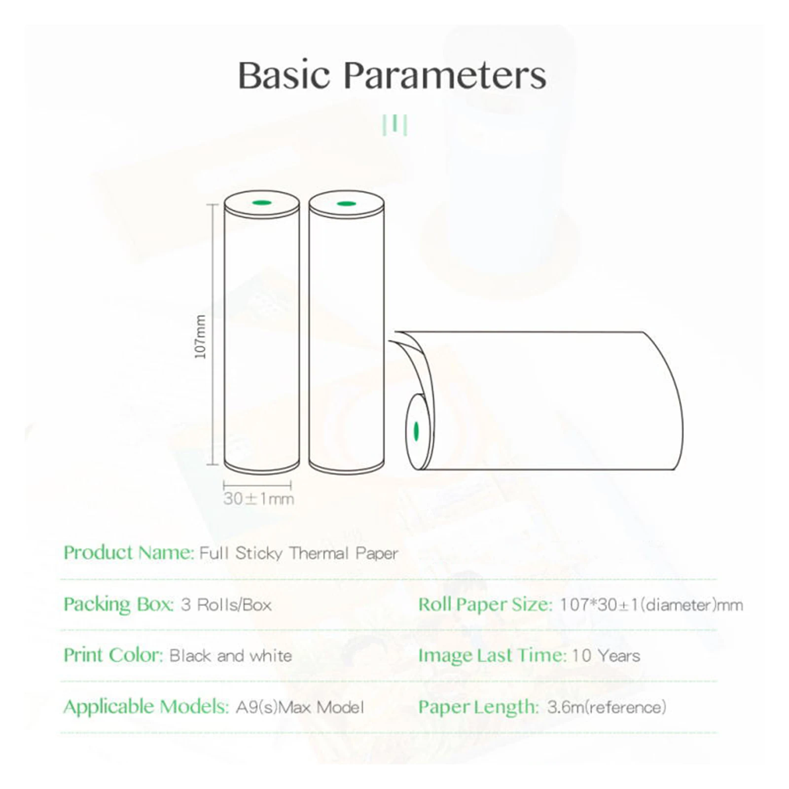 Особенности: Термобумага с 3 рулонами белых нот, размер рулона бумаги 107*30 мм, напечатанное содержимое может храниться 10 лет. Термобумага без бисфенола А, Нетоксичная и безвредная, прочная и экологичная, безопасная в использовании. Гладкая и плоская поверхность, четкое качество печати. Водонепроницаемый, маслостойкий и антифрикционный. Печать без блеска, подходит для периферийного принтера A9 Max/A9s Max mini BT. Идеально подходит для печати фотографий, заметок, списков, плана работы, журнала, офисных сообщений, учебных заметок, файлов и т. д. Характеристики: Тип бумаги: термобумага для заметок (не клейкая)/полностью липкая термобумага (по желанию) Размер рулона бумаги: 107*30 мм Количество: 3 рулона Срок хранения: 10 лет Длина бумаги (в каждом рулоне): Примечания термобумага: 6,5 метра/фута Полностью липкая термобумага: 3,6 метров/фута Посылка: 11,1*9,3*3,1 см/4,4*3,7 * дюйма Вес посылка: Термобумага для банкнот: 207 г/7,3 унции Клейкая термобумага: 187 г/6,6 унции Примечание: Пожалуйста, держите его в сухой и прохладной среде, время фото может варьироваться в зависимости от окружающей среды. Упаковочный лист: 3 рулона термобумаги