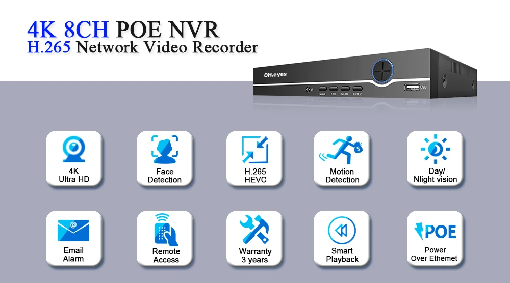 Сетевой видеорегистратор OH.eyes Ultra HD 8CH 4K POE NVR для IP-камеры POE P2P Plug And Play