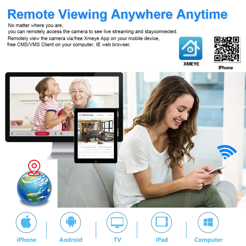 Независимо от того, где вы находитесь, вы можете удаленно получить доступ к камере, чтобы видеть прямую трансляцию и подключение. Удаленно просматривайте камеру через: бесплатное приложение Xmeye на мобильном устройстве, бесплатный клиент CMS на вашем компьютере, веб-браузер IE.
