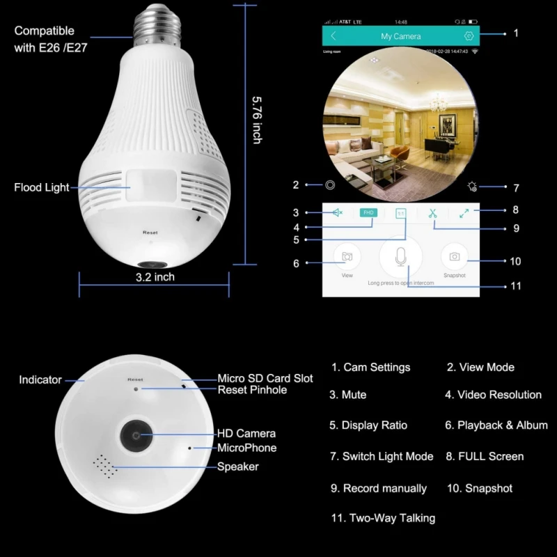 Панорамная IP-камера с углом обзора 360 градусов и поддержкой Wi-Fi, HD 1080P