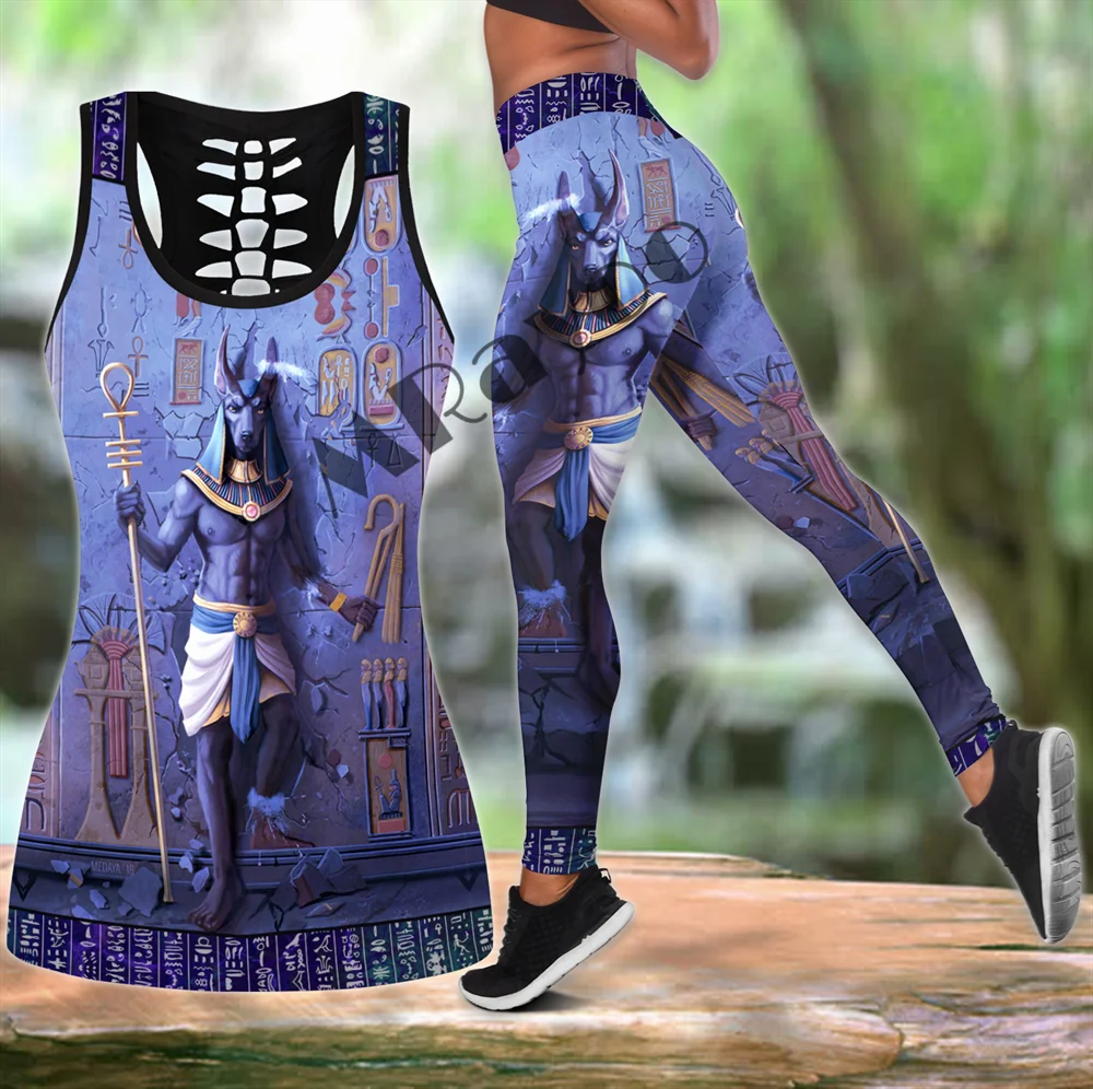 Комплект из топа и леггинсов Анубис бог синий Древний Египет с 3D принтом, женские длинные леггинсы для фитнеса, штаны для йоги, полый резервуар, LKB-25