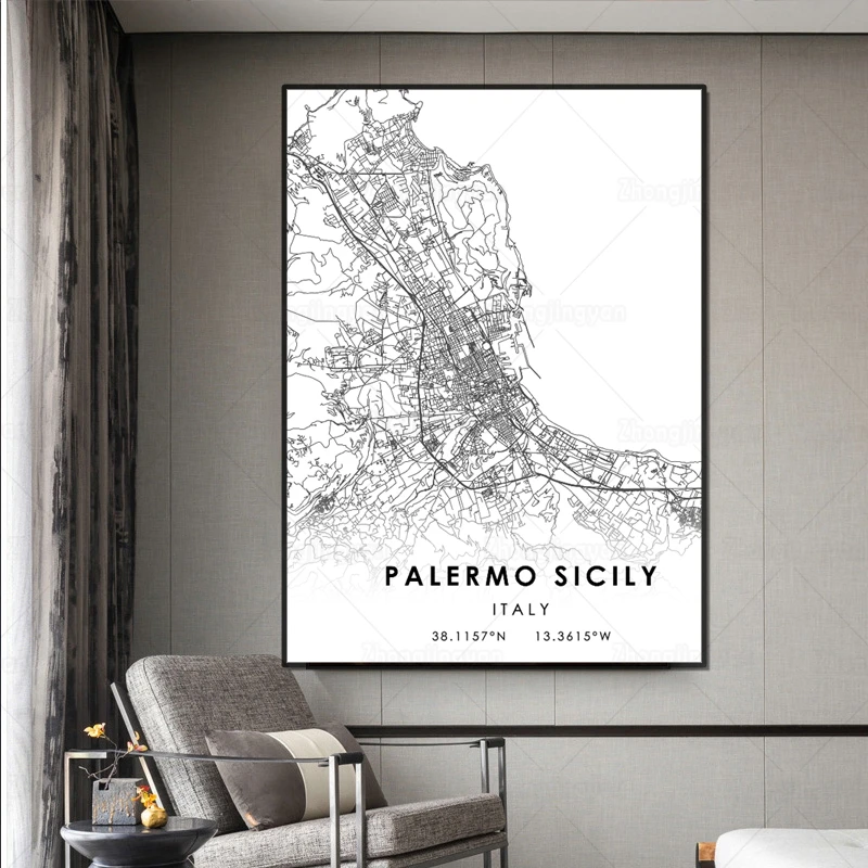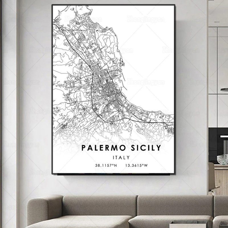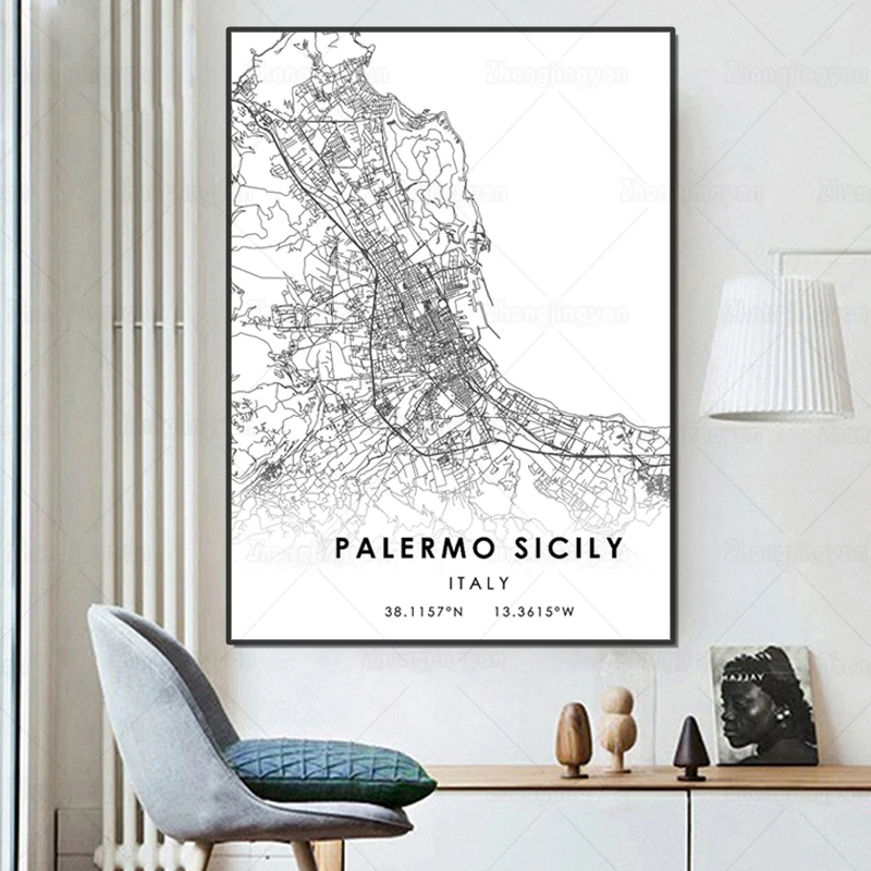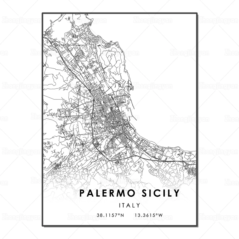 Черно-белая карта города, Италия, Палермо, Сицилия, плакат, HD печать, настенное искусство, холст, скандинавский ландшафт, живопись для домашнего декора
