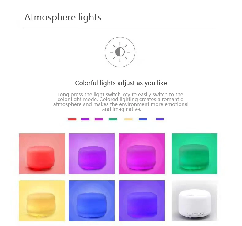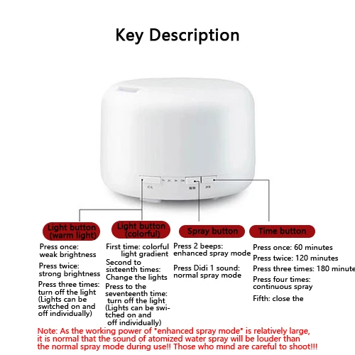 Размер изделия: 168*120 мм (500 мл)Мощность: 10 ВтВходное и выходное напряжение: AC100-240V постоянного тока 24 0,65 мАчЕмкость: 500 млВремя работы: 1 ч/3 ч/6 ч/вкл.Материал: ПП + АБС-пластикУльтразвуковая частота: 2,4 МГцХарактеристика: 7 цветов освещения. Предотвращение сухого горенияКнопка тумана: нажмите кнопку «туман», чтобы выбрать время от 1 часа/3 часа/6 часов/устойчивый.Кнопка «светильник»: нажмите кнопку «светильник», чтобы включить светодиодный светильник, и цвет будет автоматически циклироваться. Нажмите кнопку еще раз, чтобы вручную установить предпочтительный цвет и яркость дисплея. Удерживайте кнопку, чтобы выключить светильник.Посылка в комплектеАромадиффузор-1 шт.1 x адаптер1 x Руководство пользователя (не включая эфирные масла)