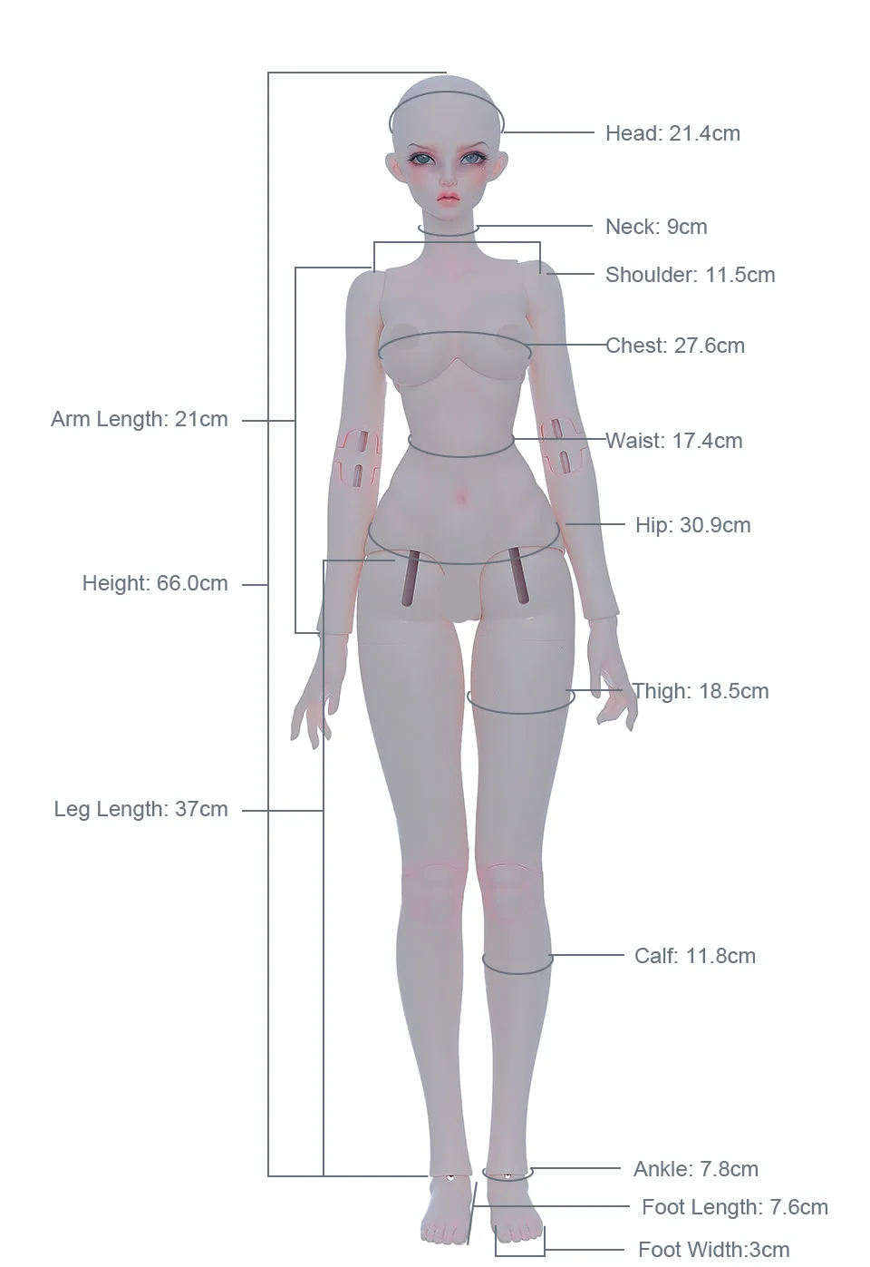 Высота: 66 смОкружность головы: 21,4 смОкружность шеи: 9 смШирина плеч: 11,5 смОбхват груди: 27,6 смОбхват талии: 17,4 смОбхват бедер: 30,9 смДлина руки: 121 смДлина ноги: 37 смОбхват бедер: 18,5 смОбхват голенища: 11,8 смОбхват щиколотки: 7,8 смШирина стопы: 3 смДлина стопы: 7,6 смГлаза: 14 ммPS: из-за ручного измерения возможна погрешность в 1-3 см, пожалуйста, поймите!