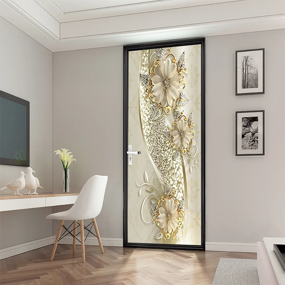 ПВХ обои, 3D наклейки на дверь с золотыми цветами для кухни, спальни, украшение для раздвижной стеклянной двери, постер, домашний дизайн, сделай сам, настенные наклейки