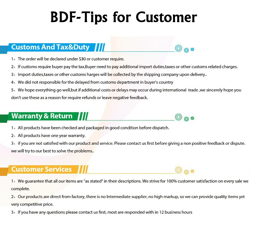 2. Наша цена не включает налоги, мы не несем ответственности за любые расходы, связанные с таможней. Если у вас есть специальный запрос, пожалуйста, дайте мне знать. Мы не принимаем спор о таможенной проблеме (оплата налогов является обязанностью каждого жителя).