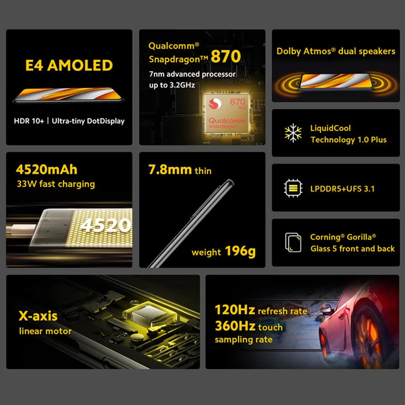 ЦП ------------- Восьмиядерный процессор Snapdragon 870, графический процессор Adreno 650Экран ----------- 6,67 дюйма E4 AMOLED, 2400x1080 FHD + dotdisplay, частота обновления 120 ГцRam + ROM ----- 6 ГБ + 128 ГБ/8 ГБ + 256 ГБКамера --------- Тройная задняя камера 48 Мп + 8 Мп + 5 Мп AI, фронтальная камера 20 МПАккумулятор ----------- 4520 мАч (тип), поддержка быстрой зарядки 33 Вт, быстрое зарядное устройство в коробке 33 Вт-------------- Глобальная версия MIUI 12 для Poco, Поддержка Google Play, Google pay, многоязычная версия и обновление OTAДругое ----------- Wi-Fi 6, Bluetooth 5,1, GPS, высокие двойные динамики, NFCПосылка ция-Poco F3 | Адаптер питания | USB кабель type-C | Адаптер для наушников type-C 3,5 мм | Защитный Чехол | Извлечение SIM-карты | Руководство пользователя | Гарантия картыСеть ---------- Netcom full, поддержка двух SIM-карт (слот nano sim x 2)Поддерживает 5g/4G/3G/2g5G: N1, N3, n5, N7, N8, N20, N28, N38, n41, N77, N784G: диапазон FDD-LTE 1, 2, 3, 4, 5, 7, 8, 12, 17, 20, 28, 664G: диапазон TDD-LTE 38, 40, 413G: диапазон WCDMA 1,2,4,5,82G: GSM 850 900 1800 1900 МГцПримечание: 5G подключения могут варьироваться в зависимости от зоны доступности и отсутствия сайта оператора поддержки.