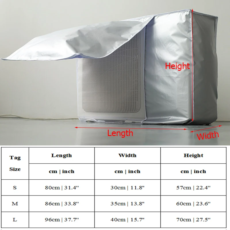 Особенности:1. Изготовлен из Оксфорда с серебряным покрытием, хорошо отражает солнечный свет, замедляет старение машины.2. Чехол также водонепроницаемый, пыленепроницаемый и солнцезащитный.3. Он идеально подходит для внешних кондиционеров.4. Антикоррозийный, дезодорирующий. Легко моется.5. Нет необходимости снимать крышку при запускеОписание:Материал: Оксфорд с серебряным покрытиемЦвет: серебристыйРазмер: S 80*30*57 см; M 86*35*60 см; L 96*40*70 см(1 дюйм = 25,4 мм или 1 мм = 0,0393 дюйма)Функция: Защита от солнца, водонепроницаемость, Пыленепроницаемость, морозостойкостьПосылка1 * Крышка КондиционераПримечания:1. Из-за разницы в освещении и настройках экрана цвет товара может немного отличаться от изображения.2. Возможны незначительные различия в размерах из-за разных измерений вручную.