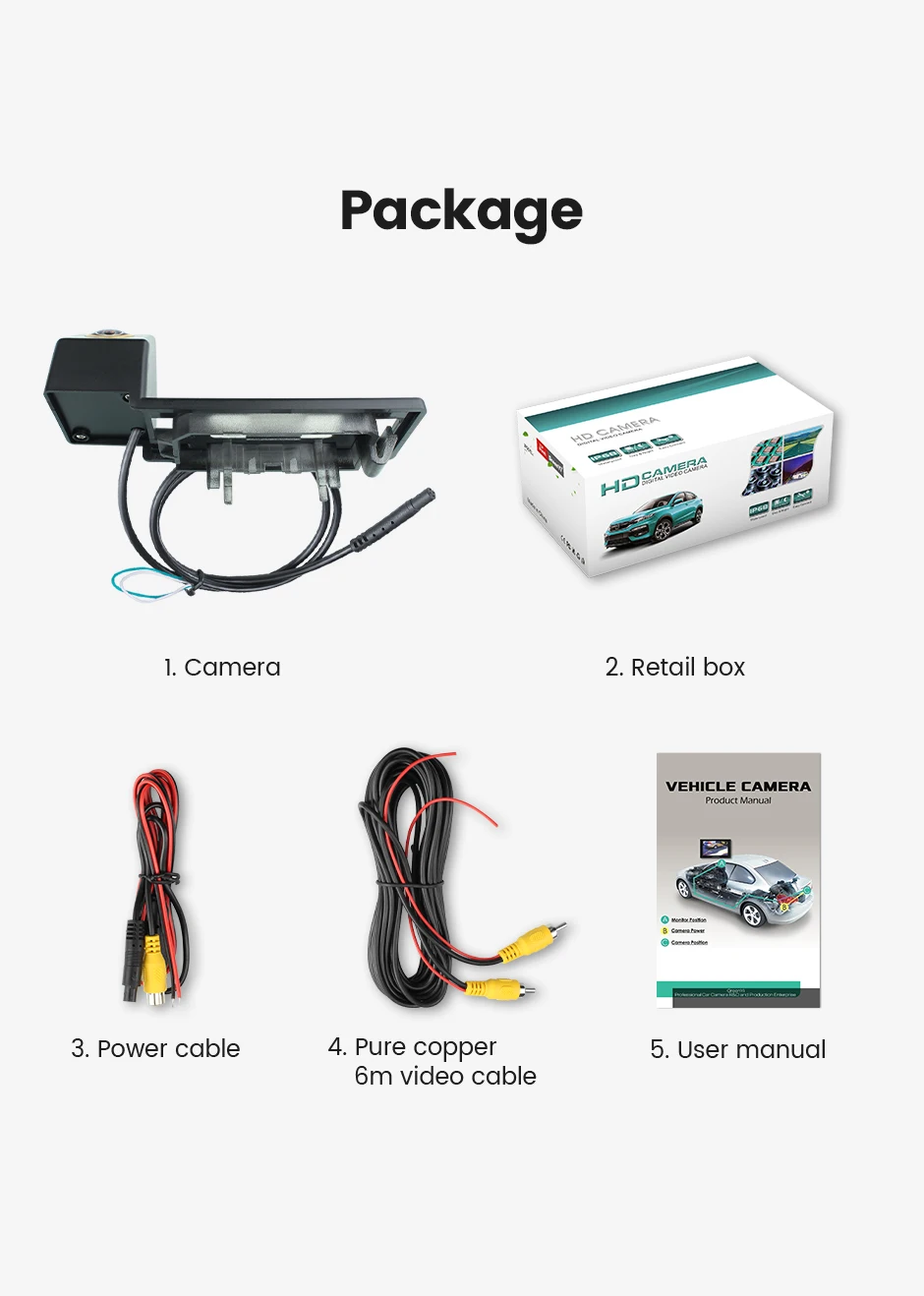 1. Камера заднего вида2. Розничная коробка3. Кабель питания4. Чистый медный 6 м видео кабель5. Руководство пользователя