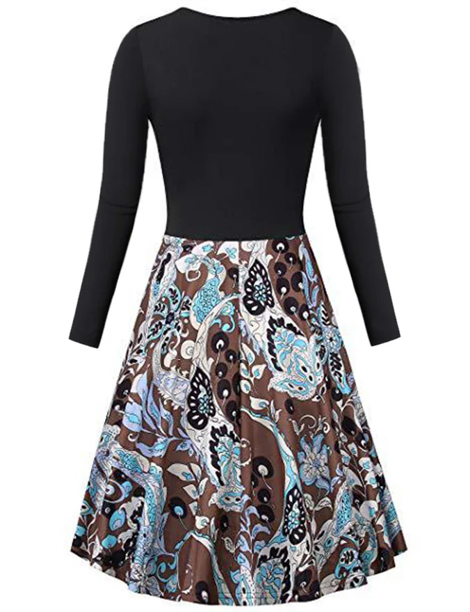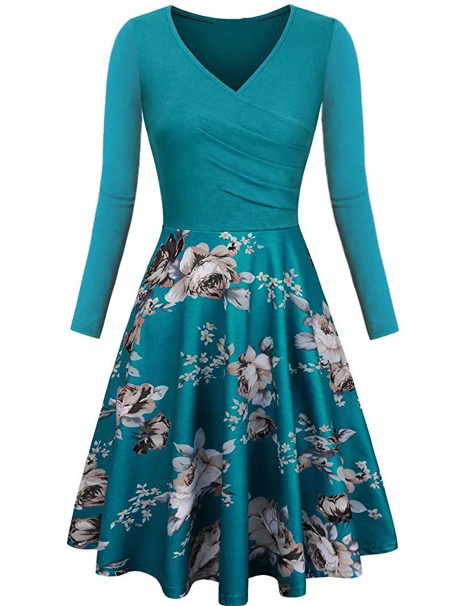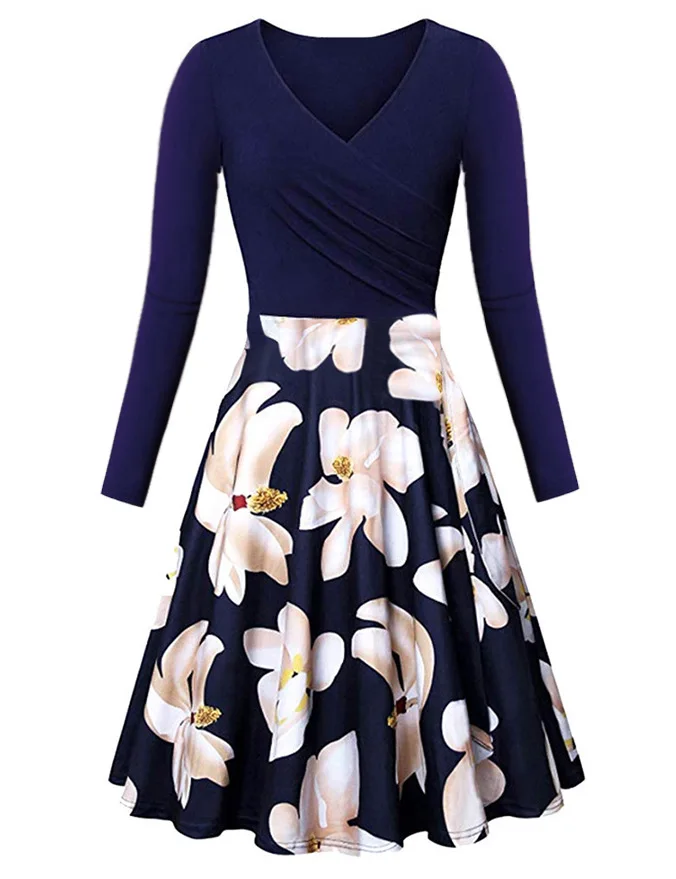 Женское платье с длинным рукавом, с V-образным вырезом и цветочным принтом, с большим подолом, облегающий слитный костюм, Осень-зима размера плюс