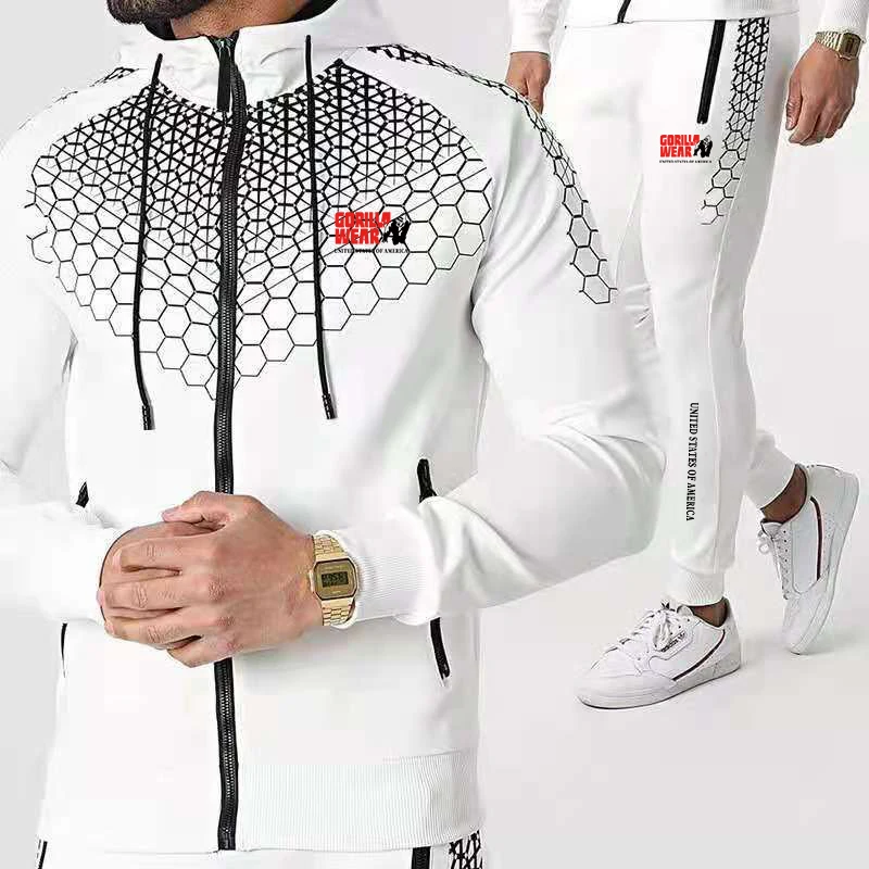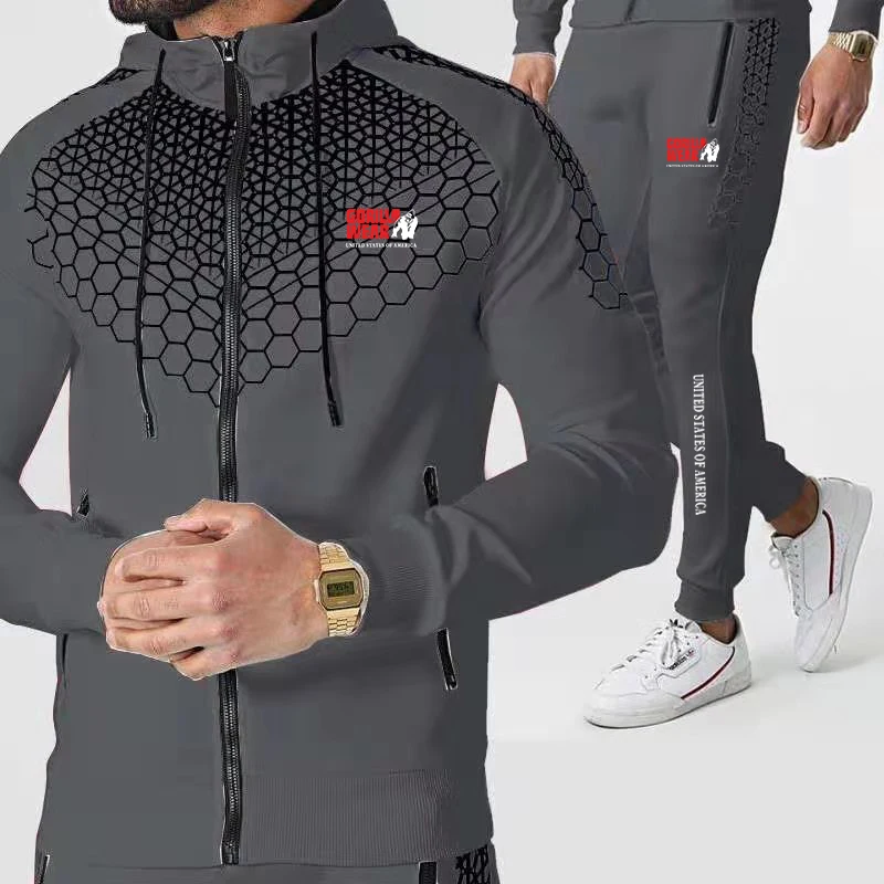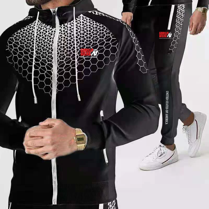 Модный брендовый комплект одежды GORILLA, куртка с принтом и штаны, спортивная одежда с сотовым дизайном на молнии, толстовки, спортивный костюм для бега, повседневная мужская одежда