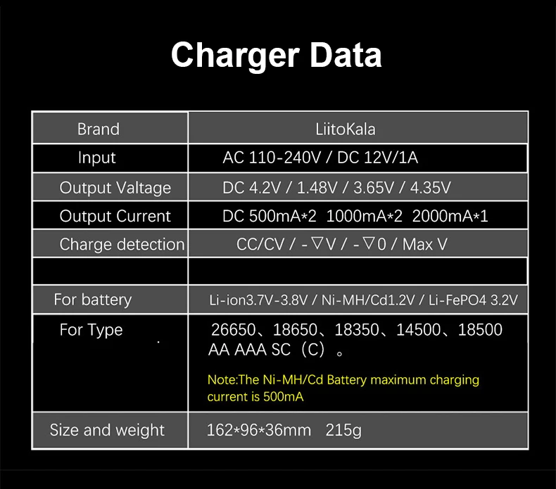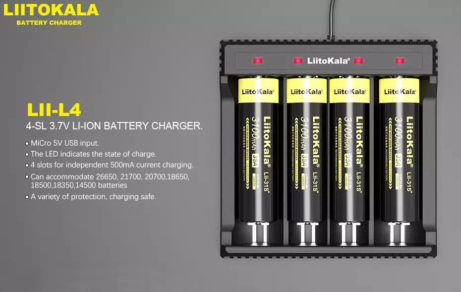 Зарядное устройство Lii-L4Бренд: LiitoKalaМодель: Lii-L4Вход: 5 В/2 АВыход: 4,2 V / 500mA * 4Подходит батарея: 18650 26650 21700 20700 20650 18500 18490 18350 и т. д.Заказы включают: Lii-L4 * 1USB кабель * 1Примечание: Не подходит для 1,2 в никель-металл-гидридного/компакт-дисков и Li-FePO4 3,2 V Батарея.