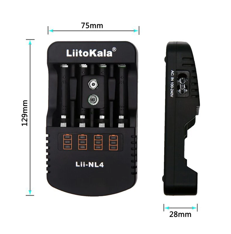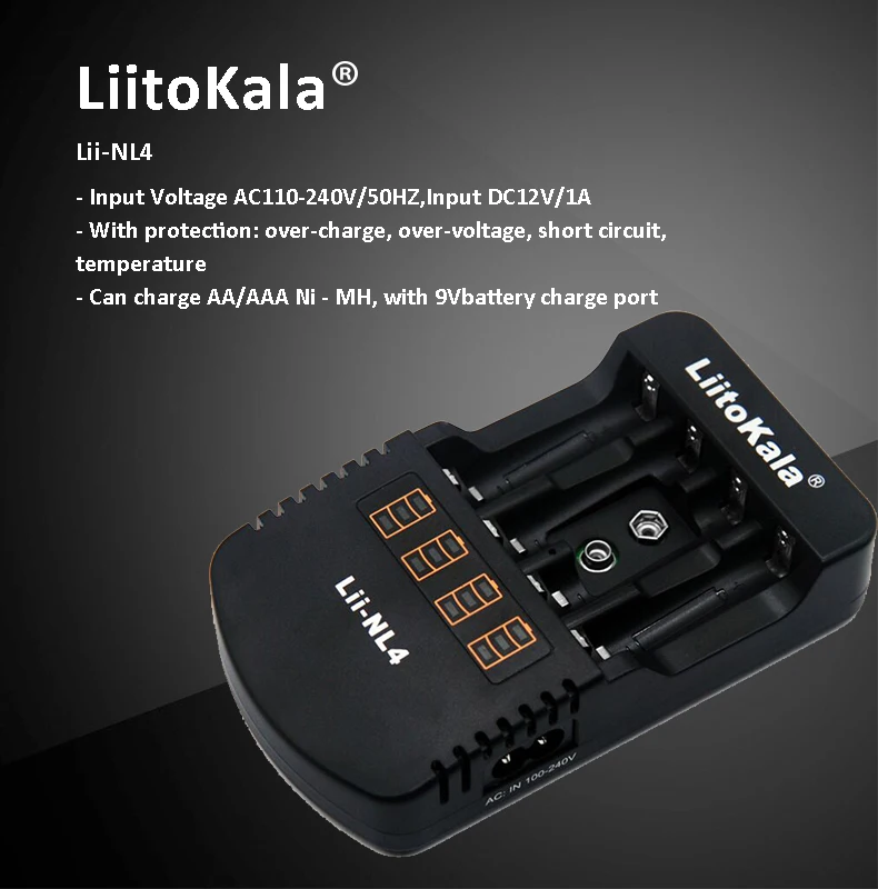 1. Описание:Пожалуйста, прочитайте это руководство перед использованием продукта, в чехол, который вы хорошо знаете, Ni - MH аккумуляторная батарея зарядки и безопасности.2. Характеристика:2.1 Входное напряжение AC110-240V/50 Гц, вход DC12V/1A.2,2 Используйте новейший и умный чип, нет необходимости проверять, когда он находится под зарядкой, встроенный автоматический стоп-режим.2,3 с защитой: перезарядка, перенапряжение, короткое замыкание, температура и так далее2,4 четыре канала заряжаются независимо и контролируются независимо, каждая батарея заряжается без привязанности к другим каналам.2,5 может заряжать AA/AAA Ni - MH, с 9Vbattery зарядным портом.3. Внимание:3,1 Этот продукт разработан специально для типа никель-металлогидридных аккумуляторов, чтобы избежать повреждений и травм, пожалуйста, не заряжайте аккумулятор, например щелочные батареи, цинковые Углеродные батареи.3,2 пожалуйста, не подвергайте воздействию дождя или водяного тумана3,3 пожалуйста, не используйте, когда зарядное устройство было повреждено или оружие было пробито.3,4 чтобы уменьшить риск поражения электрическим током, пожалуйста, отключите шнур питания при очистке зарядного устройства.3,5 не используйте герметичные, коррозионные или некротические батареи.3.6 пожалуйста, свяжитесь с профессиональными сотрудниками и не исправляйте персоналию, когда она должна быть исправлена.3,7 не разбирайте зарядное устройство.3,8 если вы не используете зарядное устройство, пожалуйста, не используйте питание и основной двигатель.3,9 если не использовать, пожалуйста, положите его в сухом и прохладном месте.4. Режим индикации заряда4,1 при зарядке три индикатора освещаются, это означает, что аккумуляторы заряжаются нормально, когда они завершены, три индикатора все еще включены, когда они находятся в режиме ожидания, индикатор выключен.4,2 в тех случаях, когда зарядное устройство для зарядки батареи 9В, индикатор светильник будет flash, когда полностью заряжен, индикатор светильник s по-прежнему.5. Параметр5.1 Входное напряжение: AC110-240V/50 Гц DC12V 1A5.2 Выходное напряжение: DC (AA/AAA) 1,48 в * 4 DC 9,0 в * 15.3 Выход ток: (зарядное устройство для никель-кадмиевых или никель-металл-ААА) 500mA * 4 9V 50mA * 15.4 перезаряжаемые батареи характеристики: AA, AAA и так далее5,5 способ прерывания: для использования △V/△t, -△V,0 V, самая высокая программа контроля напряжения5.6 Размер: 129*75*28 ммУпаковочный лист:1 * зарядное устройство Liitokala Lii-NL4 (без аккумулятора)1 * USB canble1 * Руководство пользователя1 * номер отслеживания