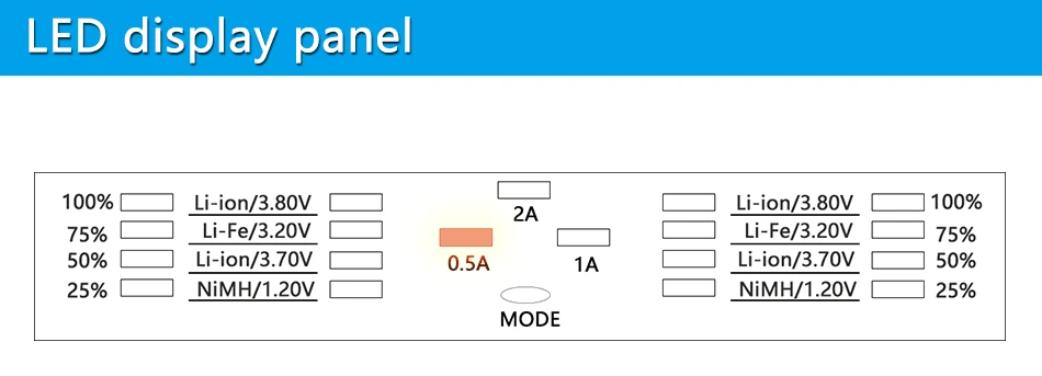 Характеристики и функции зарядного устройства:1. Dc12.0v 4.0A (минимум) вход, интеллектуальная зарядка и микрокомпьютерная система управления для каждого резервуара;2. Самая большая изюминка этого зарядного устройства заключается в том, что он может быстро заряжать с помощью нескольких каналов 2 А одновременно и никель-металлогидридного аккумулятора 9 В;3. Зарядный ток имеет пять классов 0.30A/0.50A /0.70A /1.00A/2.00A;4. Ток зарядки:4,1 литий-ионные батареи (3,70 в/3,80 в) и литий-железо фосфатные батареи (3,20 в) на электричестве, согласно покупке батареи внутреннее сопротивление путем обнаружения системы автоматической конфигурации размера тока, если вы хотите изменить размер зарядного электрического тока, может быть длительным нажатием тока, Во-первых, чтобы мигать, показывая короткое значение тока в соответствии с текущей клавишей, вы можете выбрать зарядный ток (A/0,50 0,30 0,70 2,00 1,00 A/A) (Примечание: В течение первых 1/3/6/8 слот максимальный зарядный ток никель-металл-2,0 A, 1,0 максимум в течение первых 2/4/5/7 слотов). Ток зарядки между первым и вторым слотами, третьим и четвертым слотами, пятым и шестым слотами и седьмым и восьмым слотами не будет превышать 2а в общей сложности, то есть когда один слот заряжается от тока 2A, а затем поместите аккумулятор в другой слот, Ток 2A будет падать до 1 А;4.2Ni-MH/Ni-Cd аккумулятор (1,20 В) зарядный ток установлен на 0.50A, и ток не может быть выбран;4,3 никель-металлгидридный аккумулятор (9,0 в) может заряжаться в определенном месте, и две батареи могут заряжаться одновременно. Ток зарядки каждого аккумулятора составляет около 85 мА;5. При зарядке ЖК-дисплей может отображать символ батареи/CH и паз паза Тао Тип батареи/зарядный ток A/V напряжение батареи, время зарядки ч/Емкость Зарядки мА · ч и процент %/внутреннее сопротивление батареи m Ω данные; Когда аккумулятор заполнен, данные на ЖК-дисплее будут сохранены и отображены на 100%. Символ батареи не будет двигаться, когда аккумулятор будет заполнен. Каждая пара слотов должна иметь красные и зеленые светодиодные индикаторы. Красный светильник включается при зарядке, зеленый светильник включается в режиме ожидания и прекращает зарядку, И Красный светильник будет мигать предупреждение, когда аккумулятор или слот канал является ненормальным (короткое замыкание/обратное соединение и т. Д.);6. Система может автоматически идентифицировать литиевые батареи 3,70 в и никель-металлгидридные/никель-кадмиевые (1,20 В) батареи. Нажмите кнопку MODE, чтобы вручную выбрать литий-железо-фосфат батареи 3,20 в и литий-железо 3,80 в батареи (IMR).7. С функцией активации напряжения 0 В, 1,65-2,20 в не может быть заряжен (но там будет активация тока подзарядки);8. Он имеет несколько функций защиты безопасности, таких как перезарядка, перезарядка, короткое замыкание, обратное соединение и т. д. в то же время, он может автоматически распознавать плохой аккумулятор разумно;9. Режим зарядки: постоянный ток и постоянное напряжение.* Контрольная цифра ЖК-дисплея:Iv. Электрические Технические параметры:1. Вход источника питания: постоянный ток 12,0 V 4.0A2. Выходное напряжение: 4,20 В постоянного тока для li-ion4,35 В постоянного тока для IMR3,65 В постоянного тока для LiFePO41,48 В постоянного тока для NiMH/Ni - CD9,0 В постоянного тока для NiMH3. Выходной ток:Литий-ионный Тип/IMR/LiFePO4:2.00A * 4(1/3/6/8 канал только), 0.30A /0.50A/0.70A/1.00A * 8NiMH/Nicd: 0,50 A * 8NiMH-9V: 85мА * 24. Постоянный ток/Постоянное нап