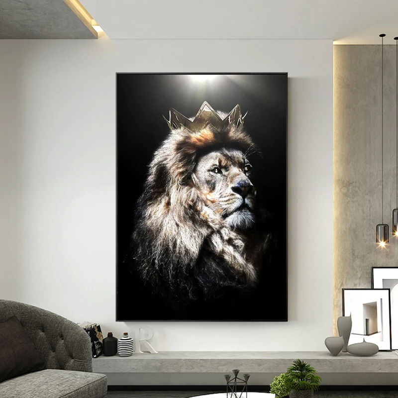 Современные животные искусство голова льва с короной картины на холсте плакаты и принты настенные картины для декора гостиной (без рамки)