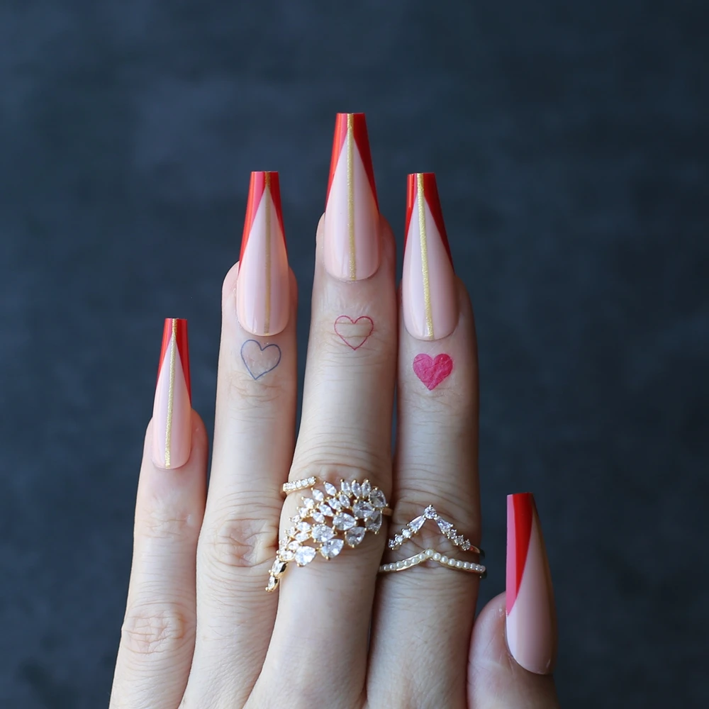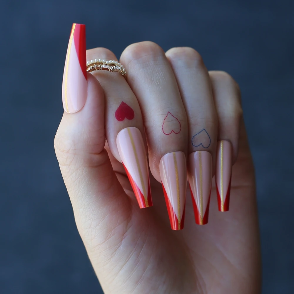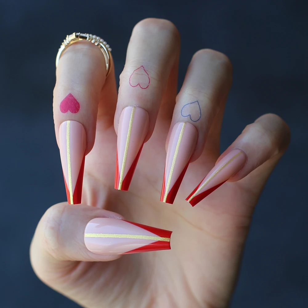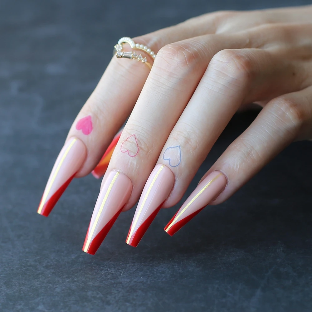 Красный V контур французский нюдовый гроб накладные ногти дополнительной длины золотая нить блеск декоративные ногти балета искусственные ногти