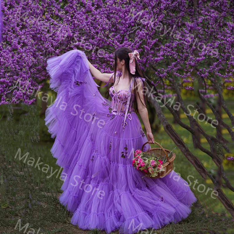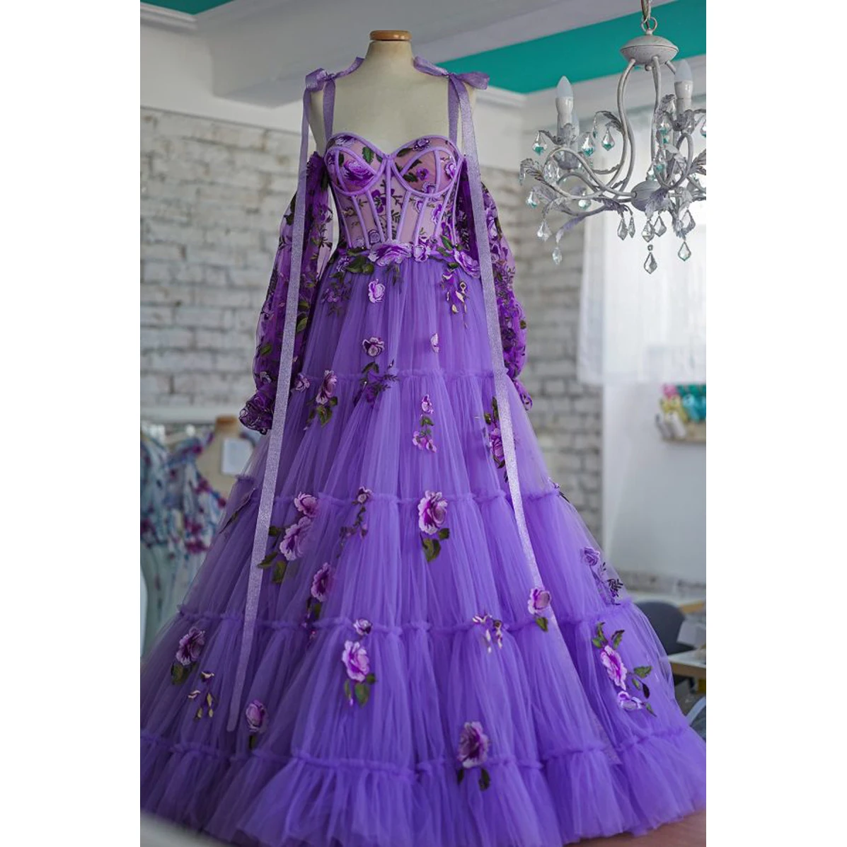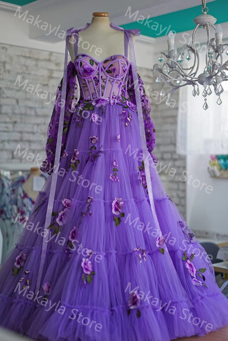 Фиолетовые красивые элегантные платья для выпускного вечера с длинным рукавом на бретельках с сердечком и цветочной аппликацией женские вечерние бальные платья из тюля