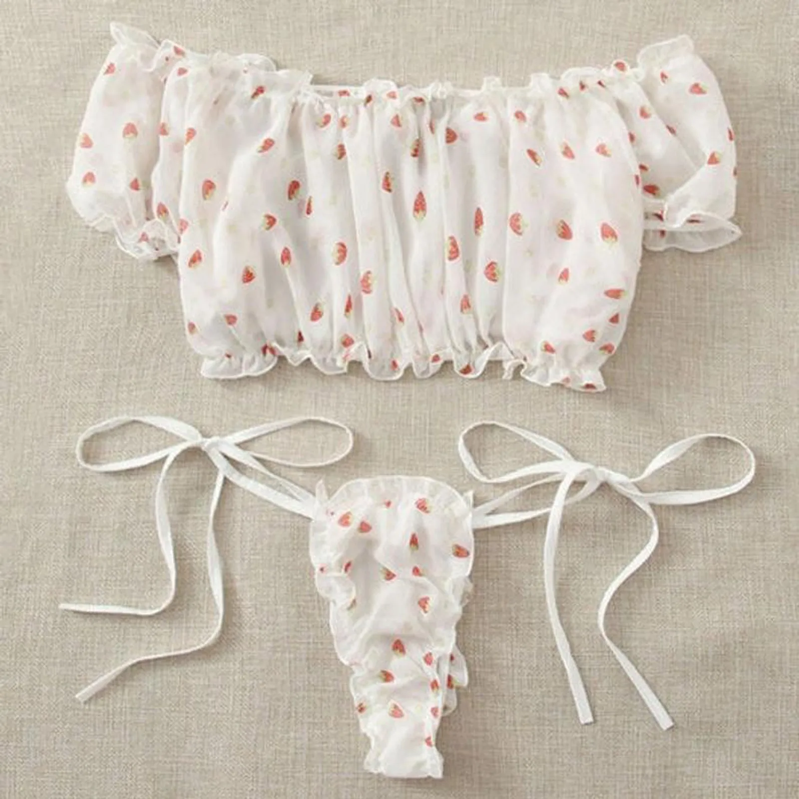 Женский кружевной бюстгальтер и тонкие прозрячные трусики в комплекте с вышивкой и бантом, ночное белье