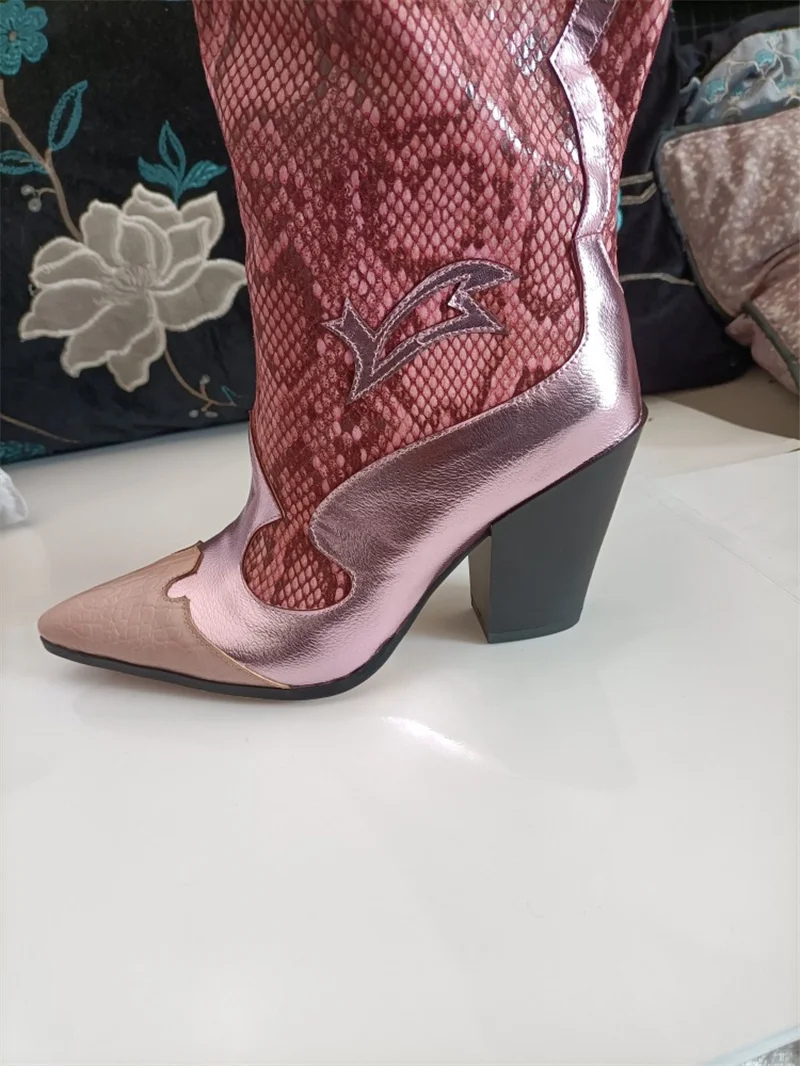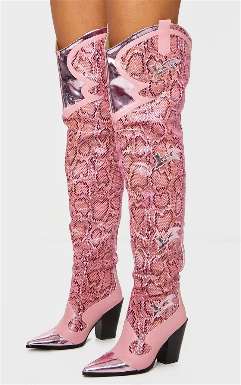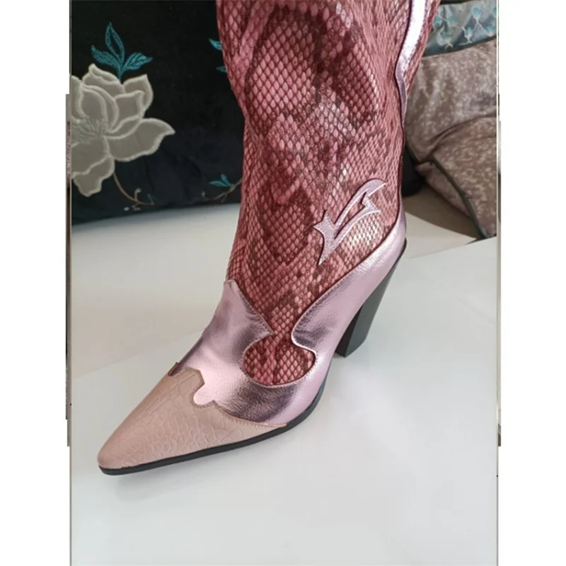 Женские сапоги выше колена, зимние сапоги с острым носком, на необработанном каблуке, без застежек, модные привлекательные женские сапоги ручной работы из змеиной кожи розового цвета