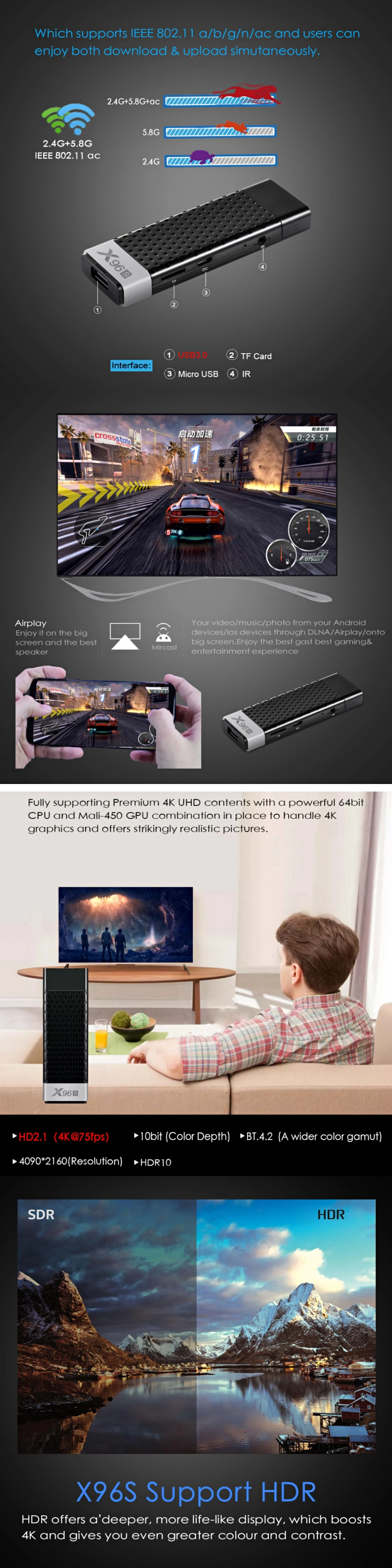 1, четырехъядерный процессор Amlogic S905Y2 ARM Cortex A53 до 2 ГГц;2, GPU:ARM Dvalin MP2;3, ОС Android 9,0;4, RAM/ROM: 2G/16G, 4G/32G;5, поддержка H.265, 4K, HDR,2xUSB2.0;6. Поддержка обновления прошивки онлайн (OTA).