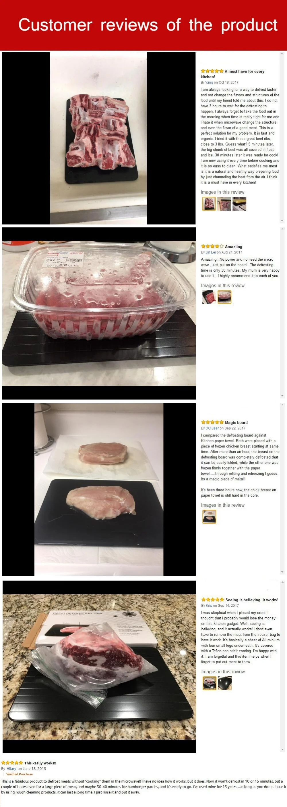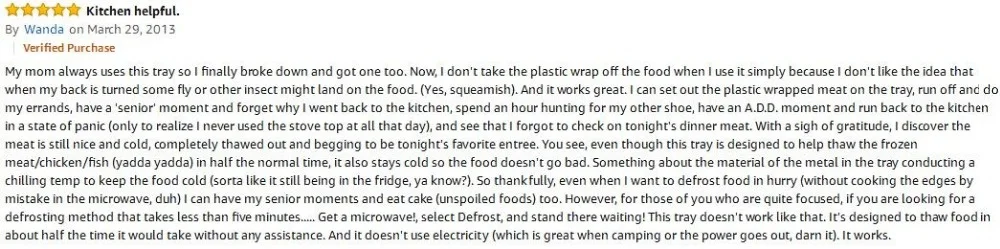 Абсолютно никаких химических веществ или электричества не используется. В отличие от микроволновых печей, которые частично готовят еду во время процесса размораживания, лоток безопасно и быстро размораживает мясо
