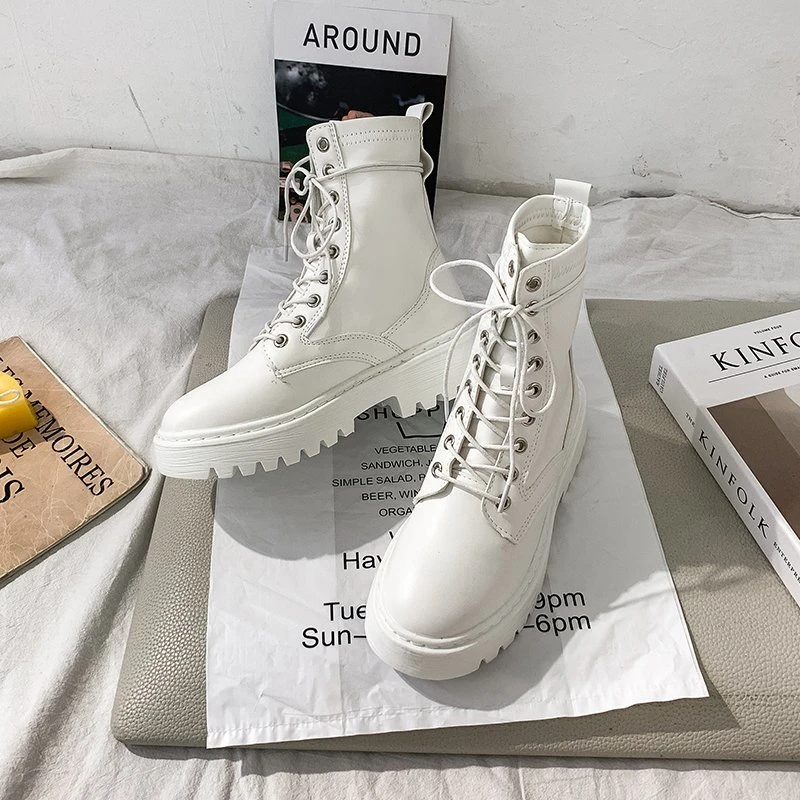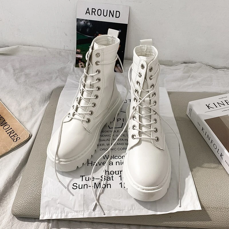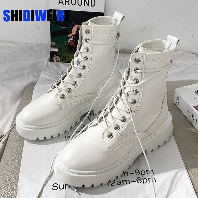 Ботинки женские кожаные, в готическом стиле, на среднем каблуке, белые, зимние, теплые, мотоциклетные, AD429