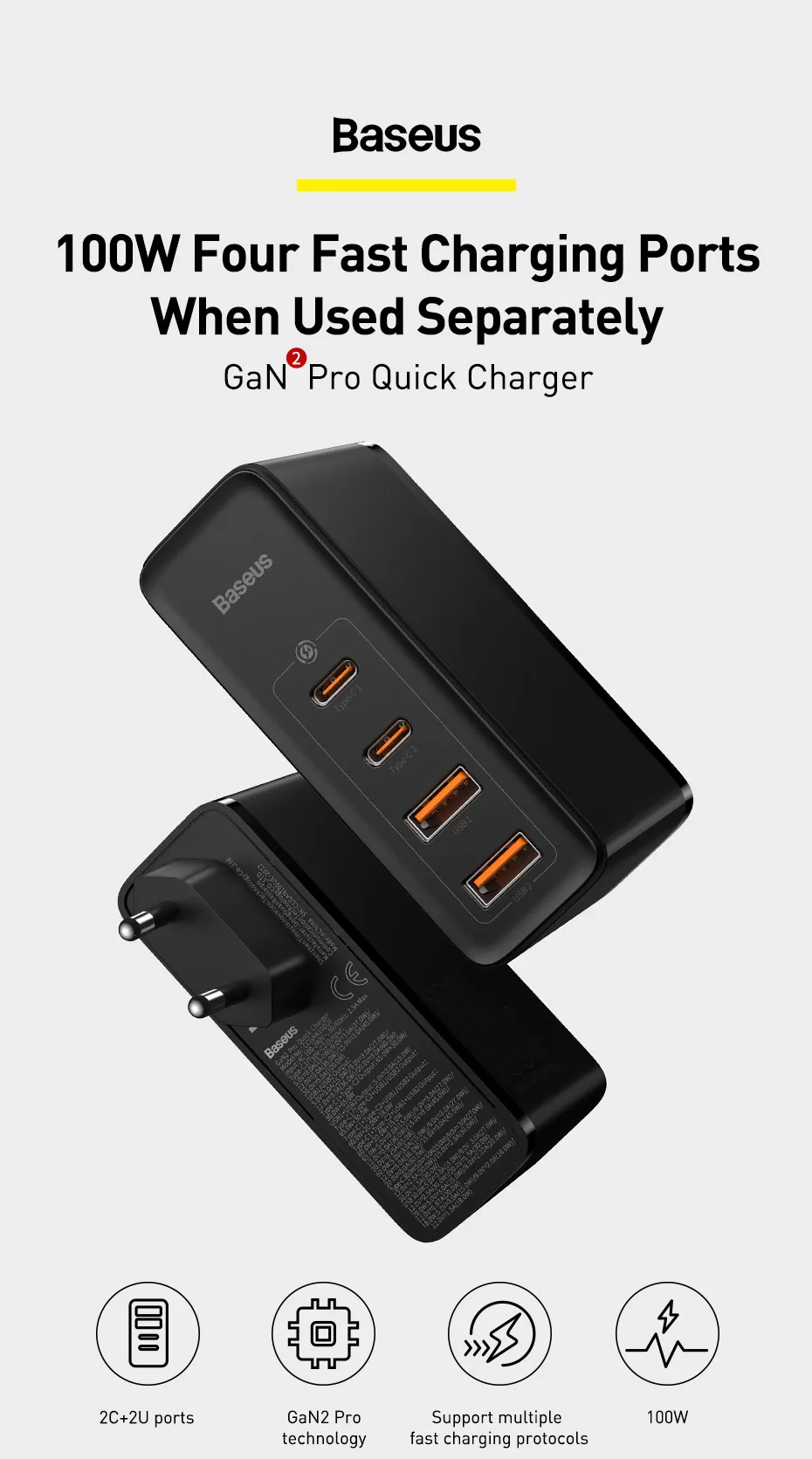 Зарядное устройство Baseus 100 Вт GaN USB C, быстрая зарядка 4,0 QC...