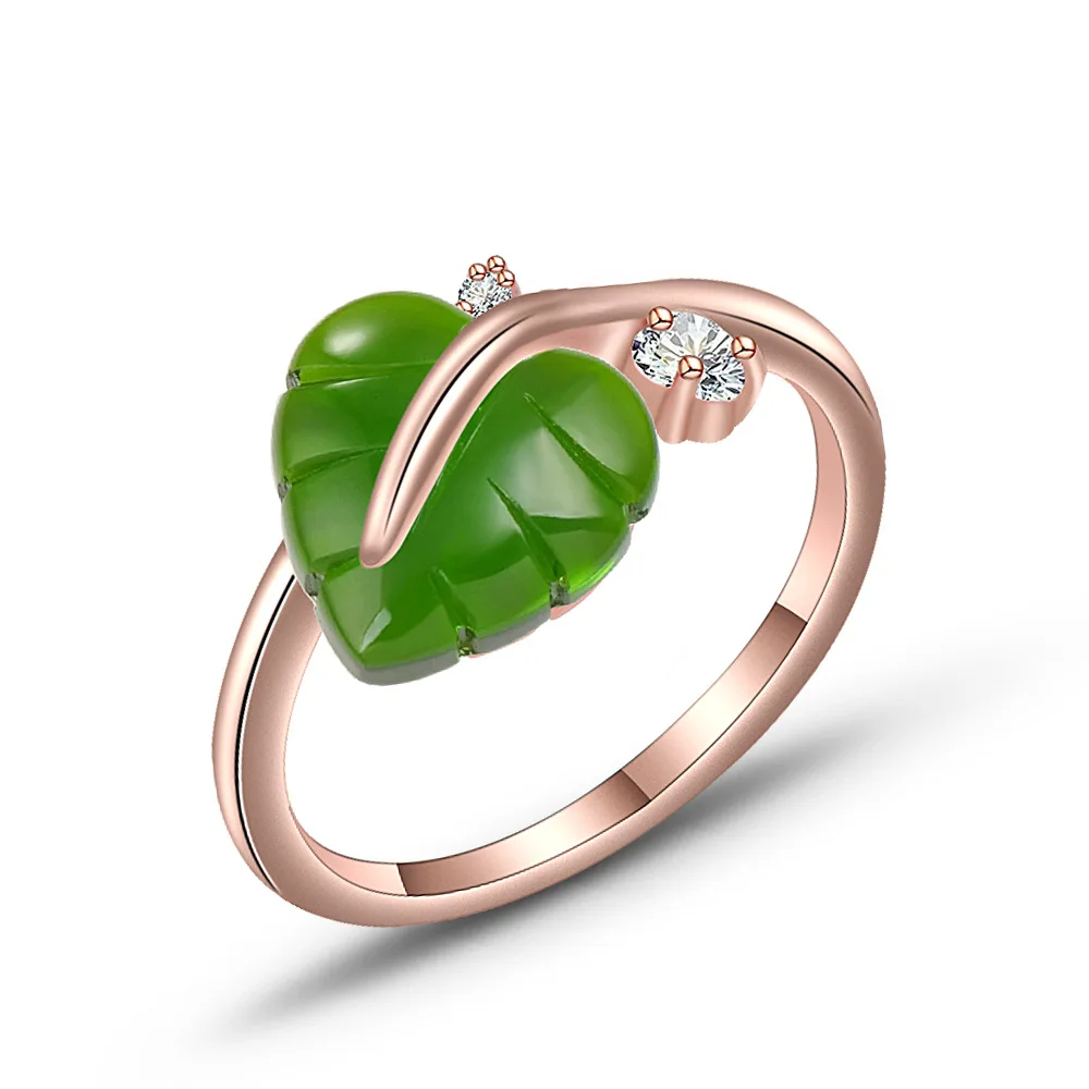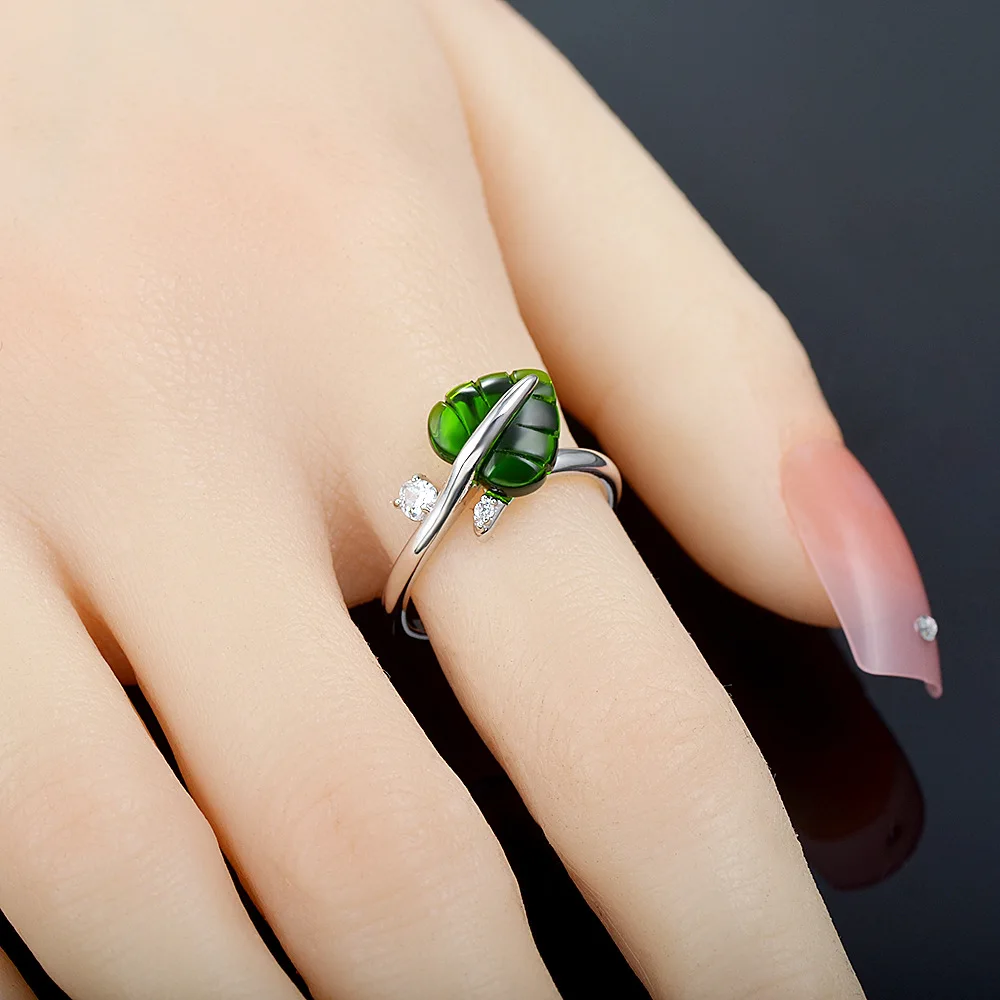 Женское кольцо из серебра 925 пробы с эмалью и зелеными листьями